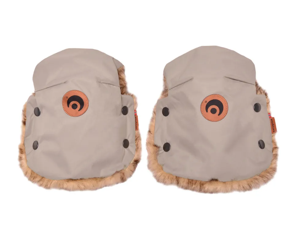 Herlige håndmuffer i samme materiale som køreposerne i vand- og vindtæt polyester, foret med kunstpels. Kan fastgøres til håndtaget på barnevognen, og holder dig varm på turen. Håndmufferne kan kobles sammen, så de kan bruges enkeltvis eller sammensat.