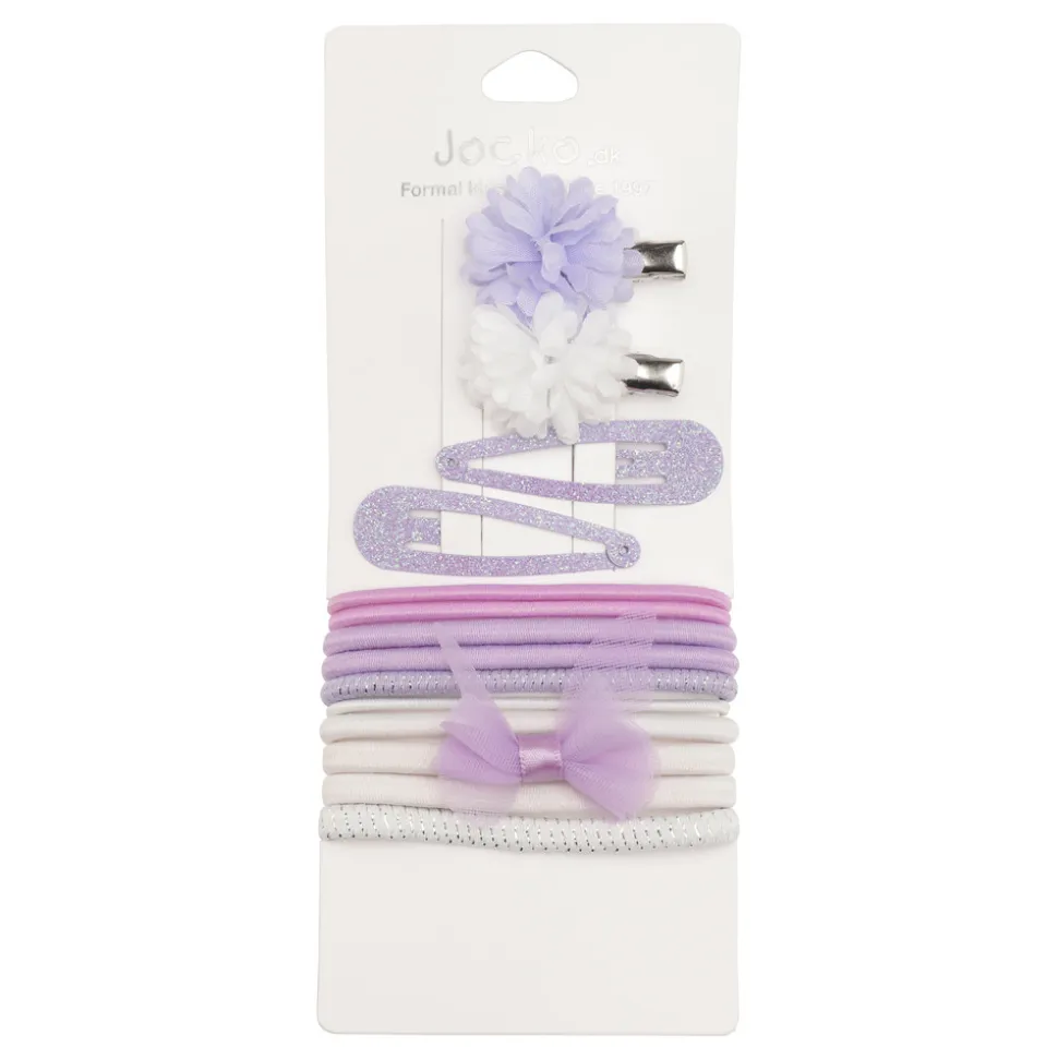Multi pakke i lilla farvetema med 14 spænder og hårelastikker