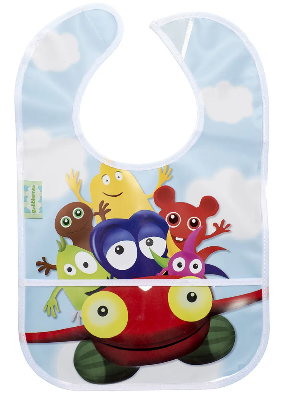 Denne praktiske hagesmæk hjælper med at holde tøjet rent. Den er ideel til spisetid, da den har en praktisk opsamlingslomme til tabte krummer. Hagesmækken er vandtæt og kan nemt tørres af med en våd klud. Den lukkes med velcro i nakken og er fri for PVC.