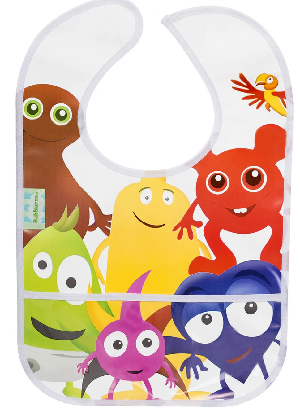 Denne praktiske hagesmæk hjælper med at holde tøjet rent. Den er ideel til spisetid, da den har en praktisk opsamlingslomme til tabte krummer. Hagesmækken er vandtæt og kan nemt tørres af med en våd klud. Den lukkes med velcro i nakken og er fri for PVC.