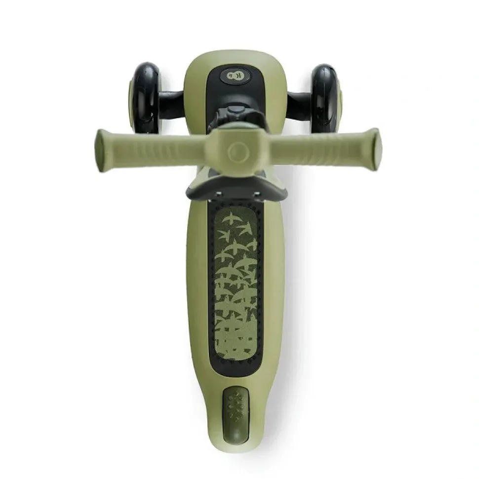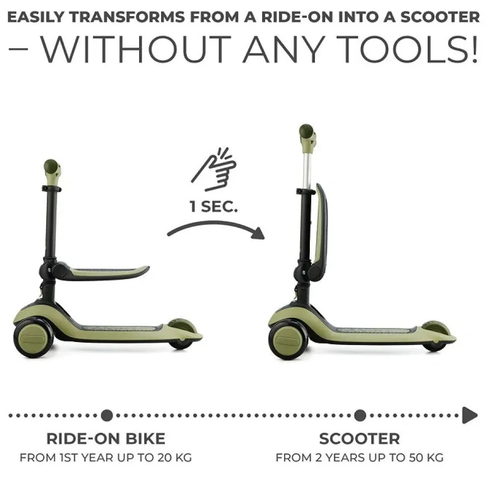 Sænkning af sædet og justering af styret tager kun et øjeblik. Takket være dette kan du omdanne cyklen til løbehjul og omvendt, selv under gåtur.