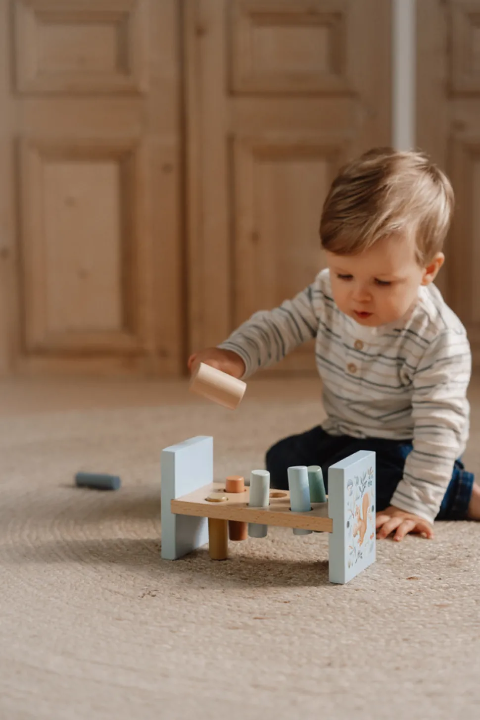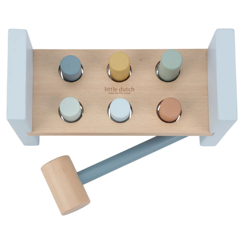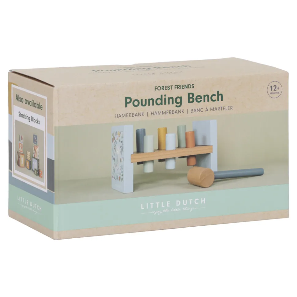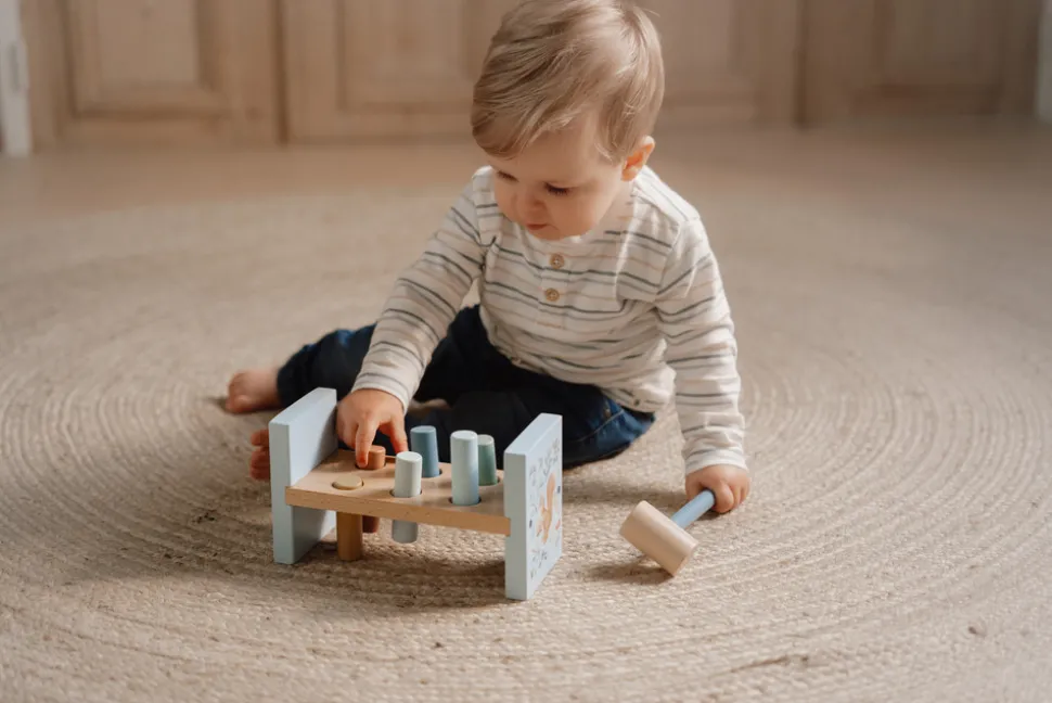 Bank, bank, bank! Brug hammeren til at slå de 6 farvede pinde ned i træbænken, og udforsk magien i Forest Friends. Når de alle er banket i, vend da bænken om, og begynd forfra! Dette er en rigtig god øvelse til udvikling af motorikken, som helt sikkert vil underholde dit barn i et stykke tid.
