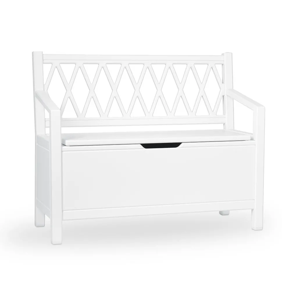 Harlequin bænken til børn fra Cam Cam Copenhagen har et moderne og klassisk look og kommer i flere fine farver. Navnet på møbelserien stammer fra det udskårede rombeformede mønster, vi kender fra den klassiske ballet om Pjerrot, Harlequin og Columbine. Bænken er et opbevaringsrum under sædet. Sædet har en glat lukning, hvilket sikrer, at de små fingre aldrig kommer i klemme. Sædet åbner op, så du kan opbevare legetøj i rummet nedenfor. Den er meget stabil og robust på grund af konstruktionen og dimensionerne. Fladpakket. let at samle. Miljøvenlig produktion og produceret under socialt ansvarlige forhold.