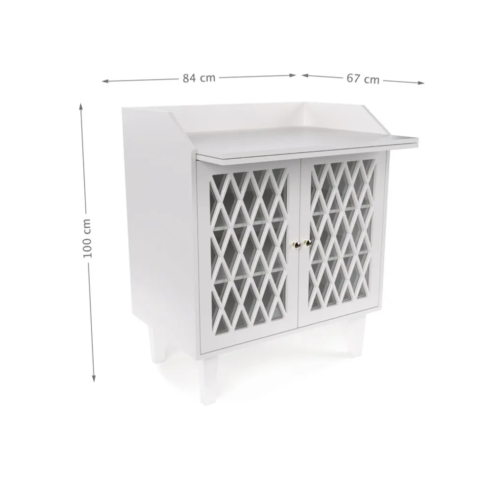 Eksklusivt puslebord med gennemtænkt funktionalitet og et tidløst design, som vil bringe elegant stil og høj komfort for store og små til ethvert børneværelse. Puslebordet er designet med multifunktionalitet og en lang levetid for øje og kan således nemt laves om til et opbevaringsskab, der kan bruges overalt i hjemmet, hvilket gør det til et meget fleksibelt møbel. For at skifte funktion, trækker man ganske enkelt udtrækspladen ud eller skubber den ind alt efter behov for pusleplads. Puslebordets døre, der er udsmykket med Cam Cam’s ikoniske Harlequin mønster og eksklusive messinggreb, er designet med soft close funktion og plexiglas på indersiden for at forhindre støv i at komme ind i skabet. Skabet har to justerbare hylder, som tilbyder masser af opbevaringsplads til alle puslenødvendighederne samt tøj eller andre tekstiler. Puslebordet leveres usamlet i 2 kasser og er nemt at samle uden brug afspecialværktøj. Puslebordet er FSC Mix certificeret og produceret i Europa under miljøvenlige og socialt ansvarlige forhold. Det er malet med børnesikker, vandbaseret maling. Navnet Harlequin refererer til det rombeformede mønster kendt og elsket fra Pierrot La Lune balletten.