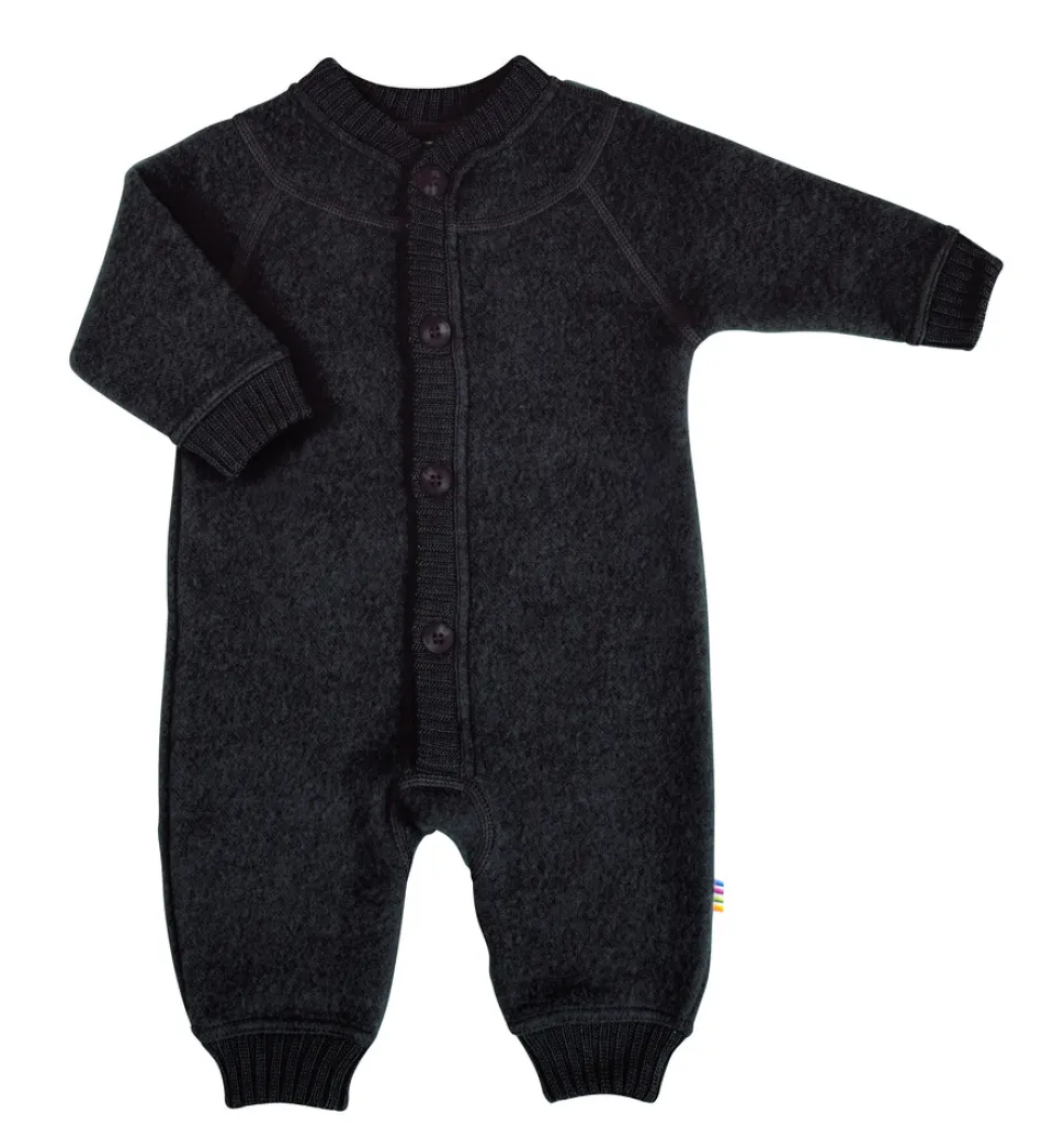 Heldragt. Lukkes foran med knapper. Ribkant i hals, knaplukningen, ærmer og ben. En kraftig børstet uldkvalitet som er ekstra blød. Brug dragten i autostolen eller barnevognen.
