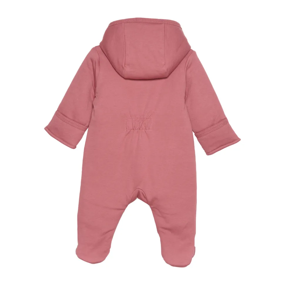 Vatteret heldragt med print på brystet. Dragten har påsyede fødder og fold, der kan lukkes om fingrene. Fast hætte. Lukkes med trykknapper langs den ene side samt en trykknap øverst. Certificeret i hht. STANDARD 100 by OEKO-TEX® cert. nr. SH020 156011 TESTEX, tiltro til tekstiler