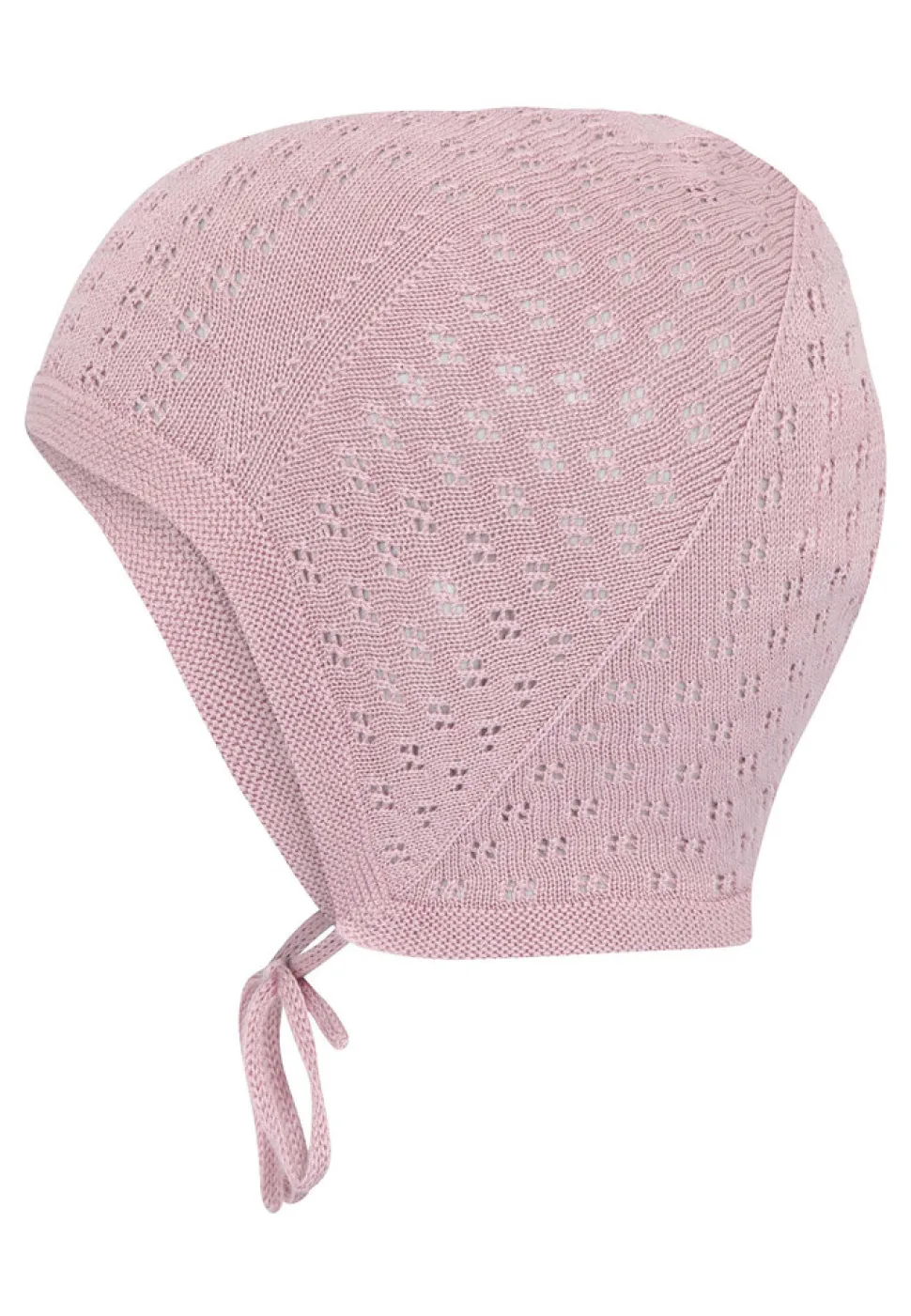 Smuk strikket babyhætte fra mpKids i den blødeste 100% viskose-bambus. Motorhjelmen dækker pande og ører og beskytter mod vinden. De bløde bånd under hagen sikrer, at motorhjelmen bliver på plads.