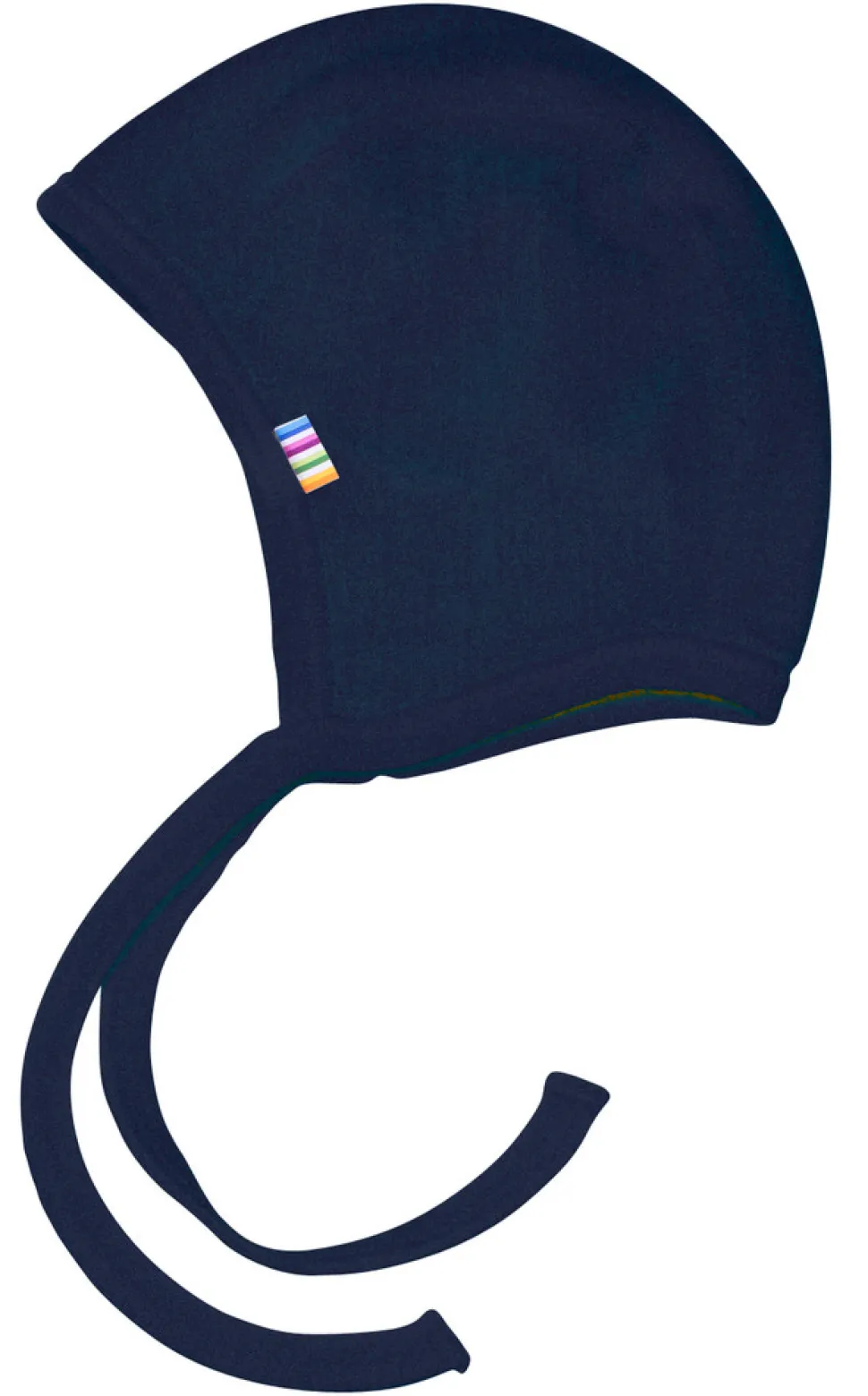 Hjelm med bindebånd. Dobbelt lags. Ensfarvet. Blød, elastisk let uldkvalitet med lodret rille mønster som er behagelig at have. Pure merino wool og Nordic Ecolabel mærket.