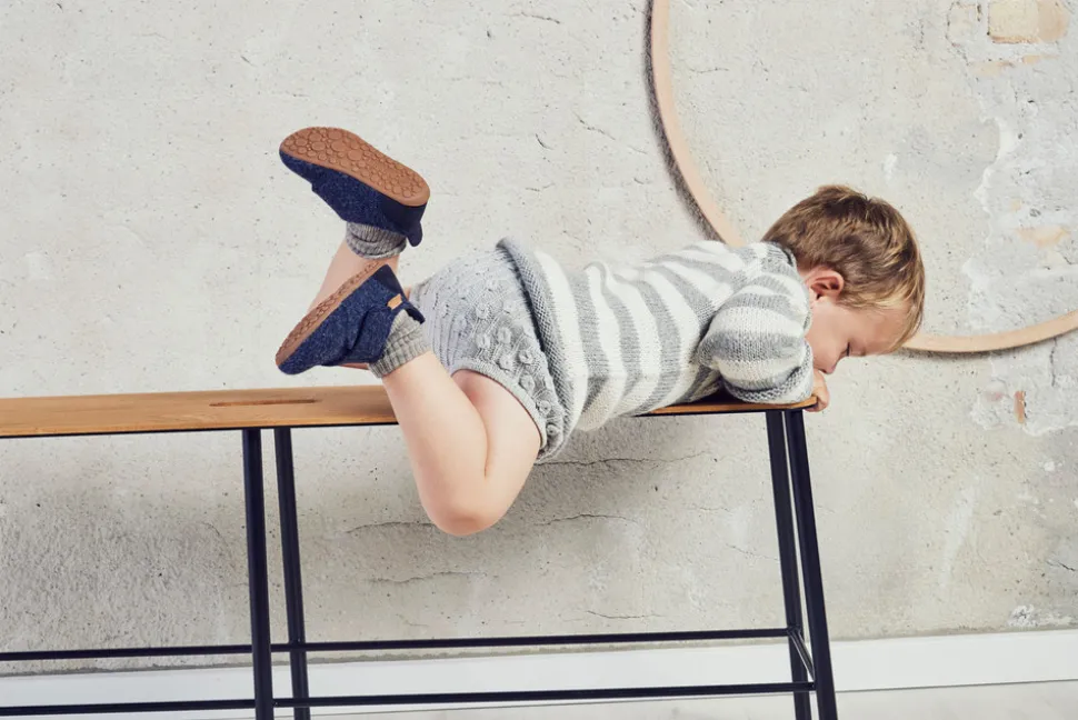 Hjemmesko, som også kan bruges som prewalker med velcrolukning, skindfoer og en blød sål af ruskind og skridsikker gummi, der giver den optimale støtte. Hjemmeskoen er produceret i 100% naturligt uld, der er lukket rundt om foden og samtidig giver foden plads til at vokse.