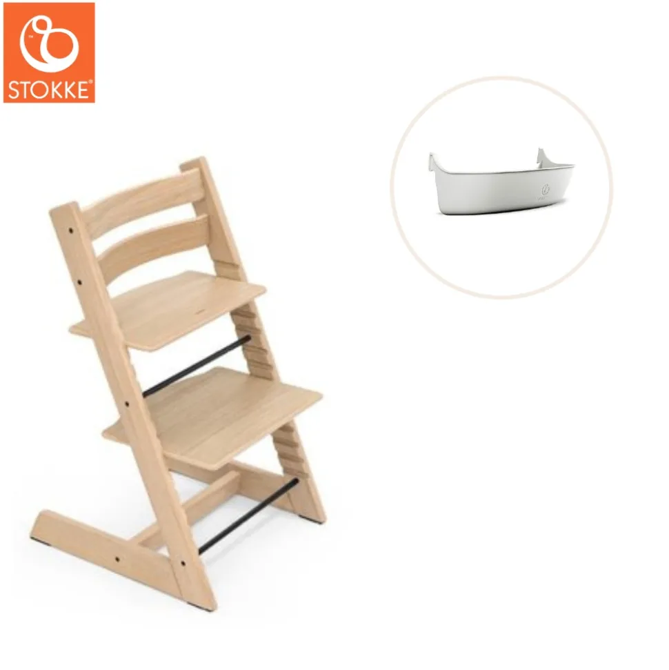 Højstolen: Produceret i eg, som er en stærk træsort, der gør produktet stabilt og holdbart, og sikrer en lang levetid. Det er let at tilpasse sidde- og fodplade i både højde og i dybden, i takt med at barnet vokser. Dermed opnås en optimal siddestilling med god bevægelsesfrihed og støtte for både fødder og ryg. Den stabile fodplade giver dit barn sikkerhed og frihed til at bevæge sig på stolen, hvilket stimulerer barnets motoriske udvikling. Fuld fodstøtte sikrer desuden at barnets ben ikke kommer til at sove. Når stolen er justeret korrekt sidder dit barn behageligt og ergonomisk korrekt uanset alder. Med Tripp Trapp® højstolen kommer dit barn til at sidde med ved spisebordet og nyde måltiderne sammen med resten af familien.