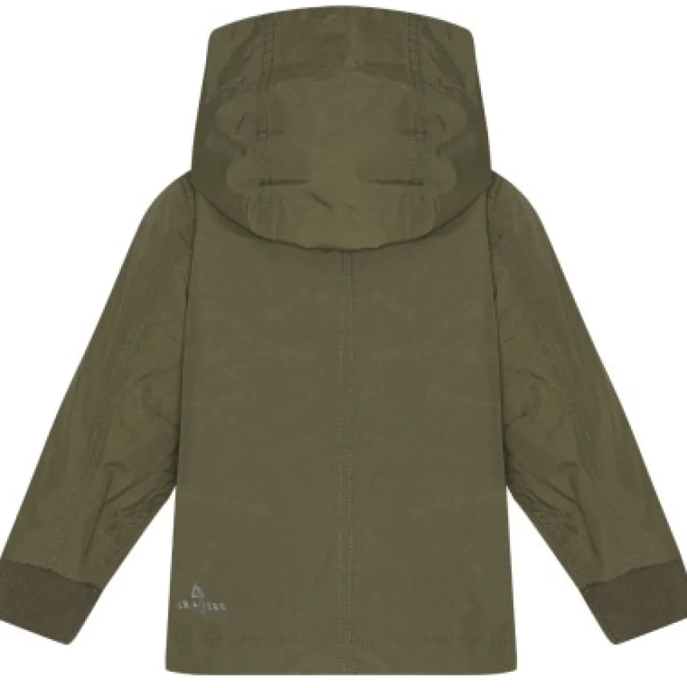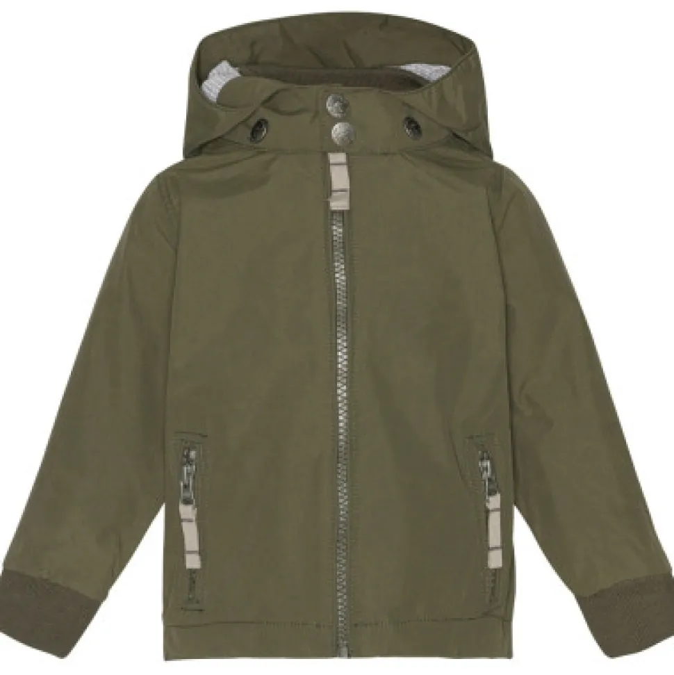 Baby forårsjakke, vandtæt og åndbart yderstof med tapede sømme. Mini ternet bomuldsfor, aftagelig hætte og rib i hals og ærmer.