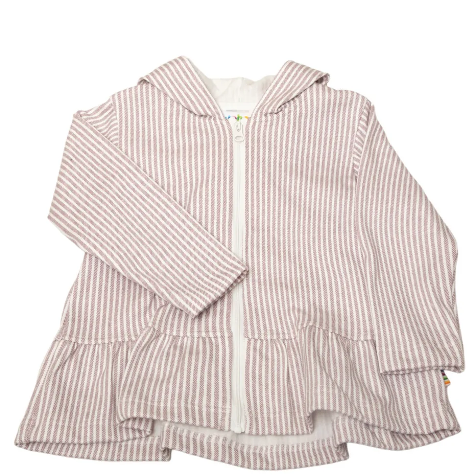 Jakke med hætte, lynlås og flæse fornedenn som en sød detalje. En blød og stabil økologisk bomuldskvalitet, som er tæt i strikningen og meget behagelig at have på. Sød stribet print. Oeko-tex 100 mærket.