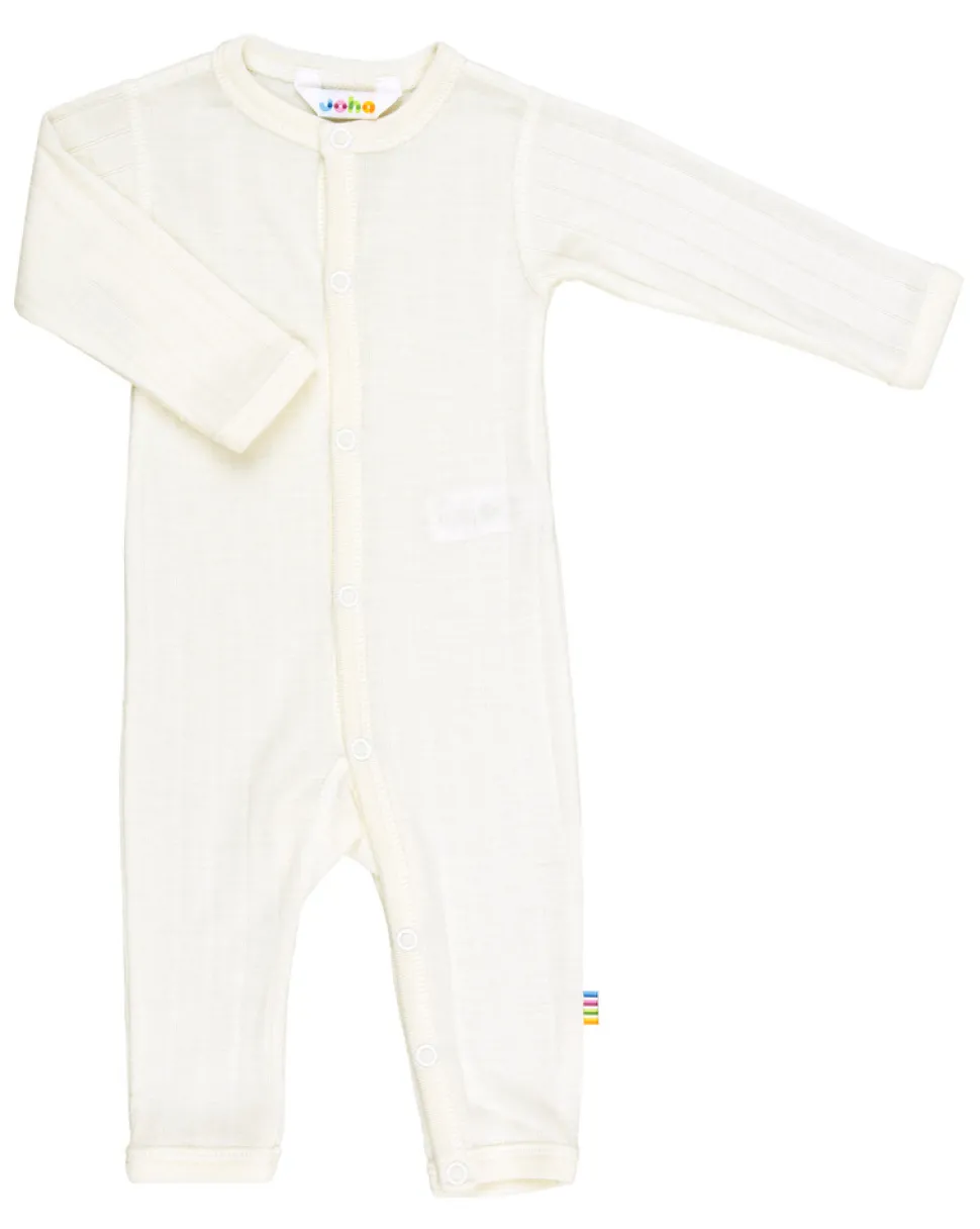Heldragt. Lukkes med trykknapper helt ned gennem det ene ben. En ekstra fin uldkvalitet med silke som er dejlig blød. Lodret rille mønster og et lidt skinnende udtryk gør denne kvalitet ekstra fin og lækker. Ensfarvet. Wool rich blend og Oeko-tex 100 mærket.