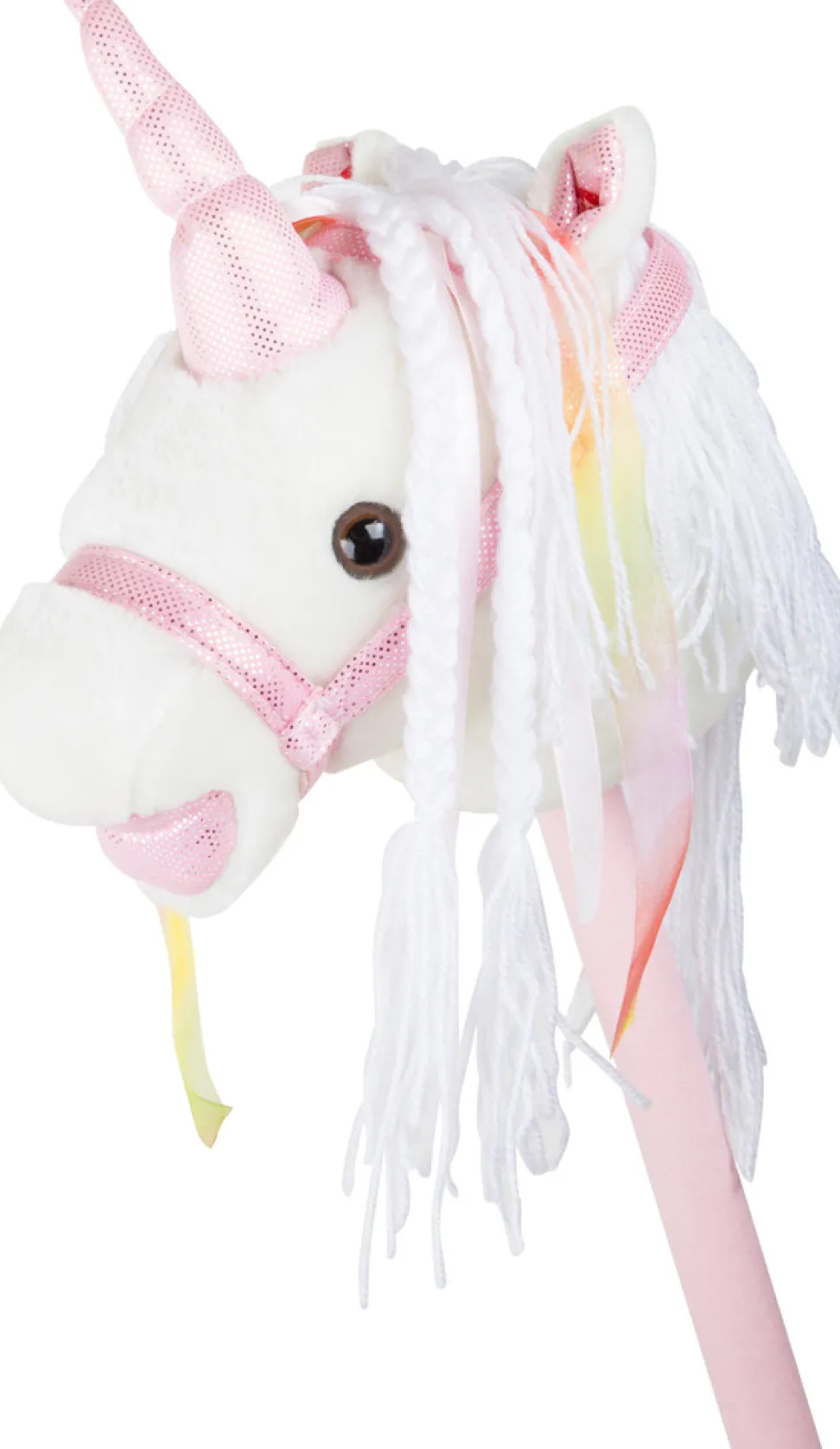 Pinden er beklædt med blødt stof og farverige bånd flagrer i manken. Når dens højre øre trykkes ned, vrinsker den tre gange. Batterier medfølger.