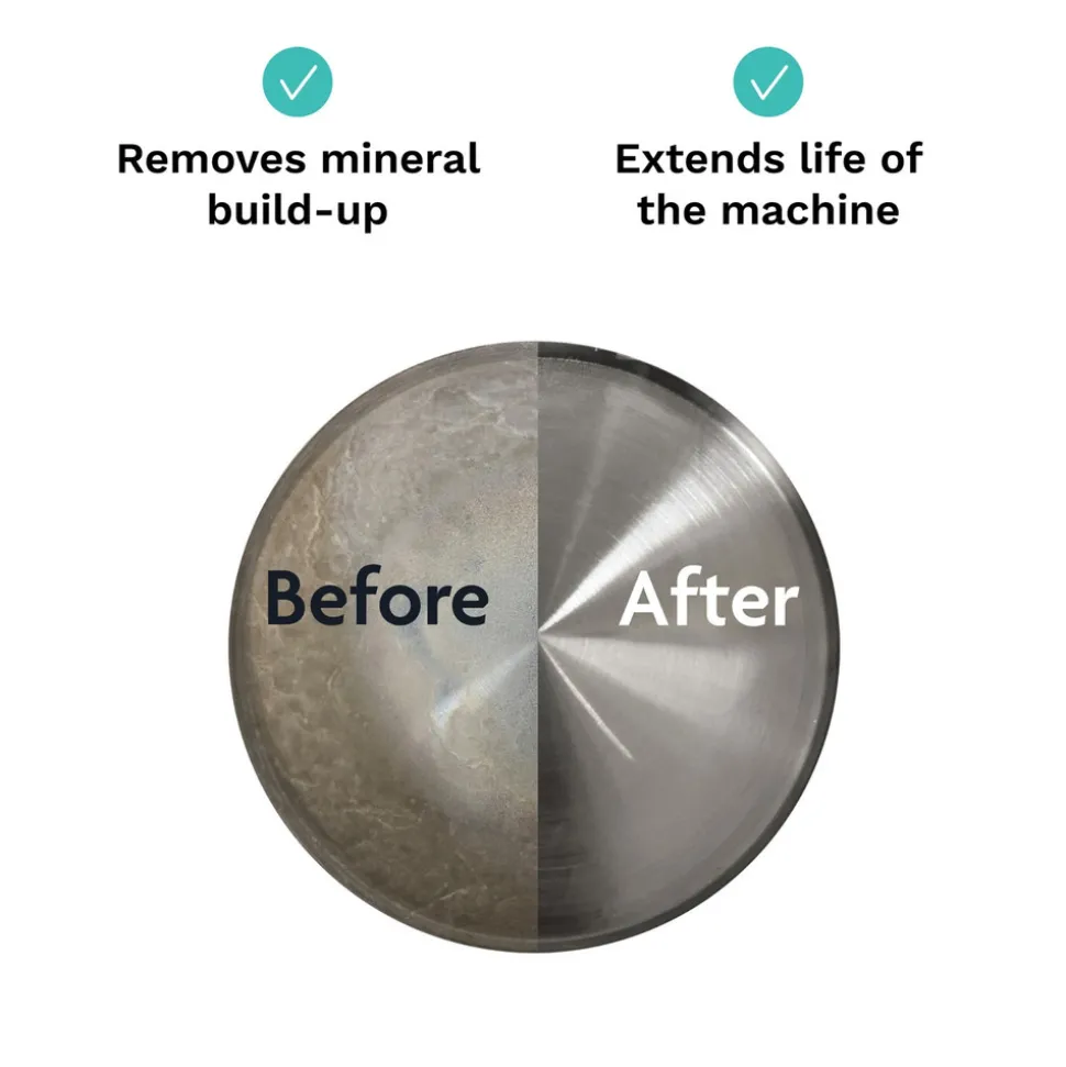 Læg en tablet i vandtanken, start rengøringsprogrammet, og skyl derefter med rent vand. Regelmæssig brug forebygger kalk, beskytter varmeelementer og sensorer og forlænger apparatets levetid.