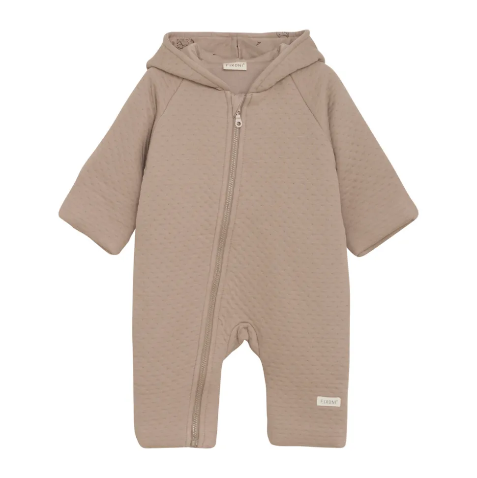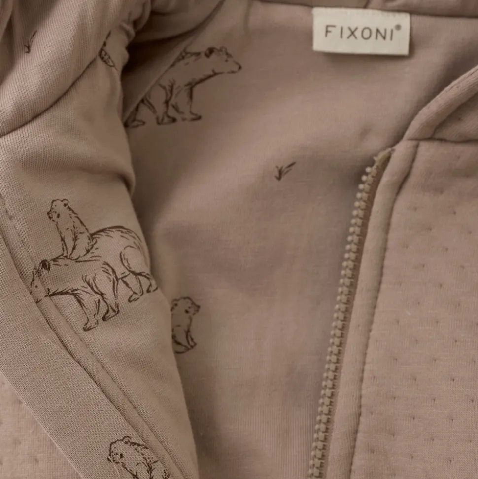 Blød køredragt fra FIXONI i ensfarvet design med sødt printet foer. Dragten har en praktisk lynlås, der går fra midten og skråt ned til højre ben, hvilket gør den nem at tage af og på. Den er designet med fast hætte samt foldbare fødder og luffer, som giver ekstra varme og fleksibilitet.