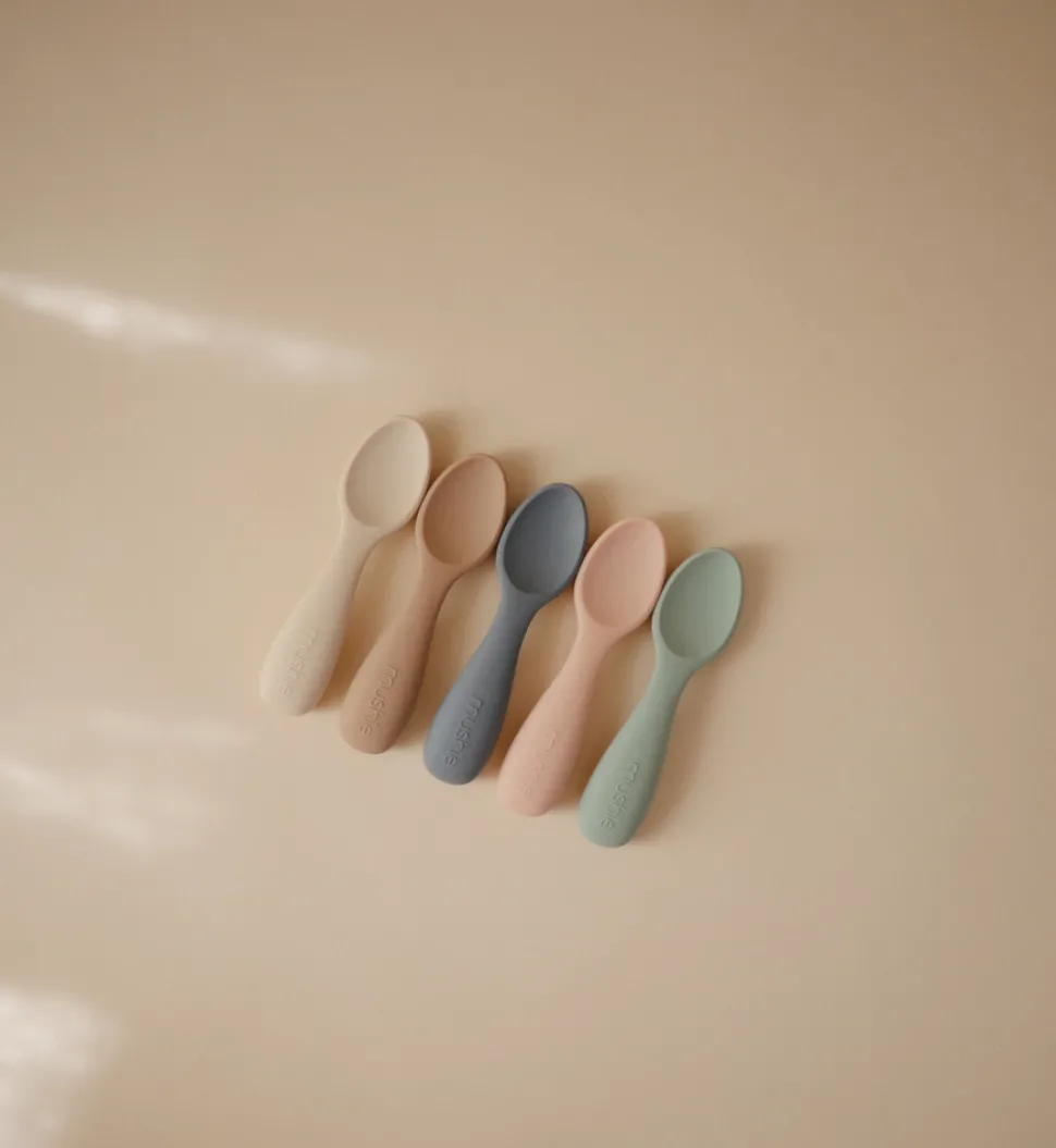 Mushie Toddler Starter Spoons – Silicone 2-Pack – Cambridge Blue/Shifting Sand