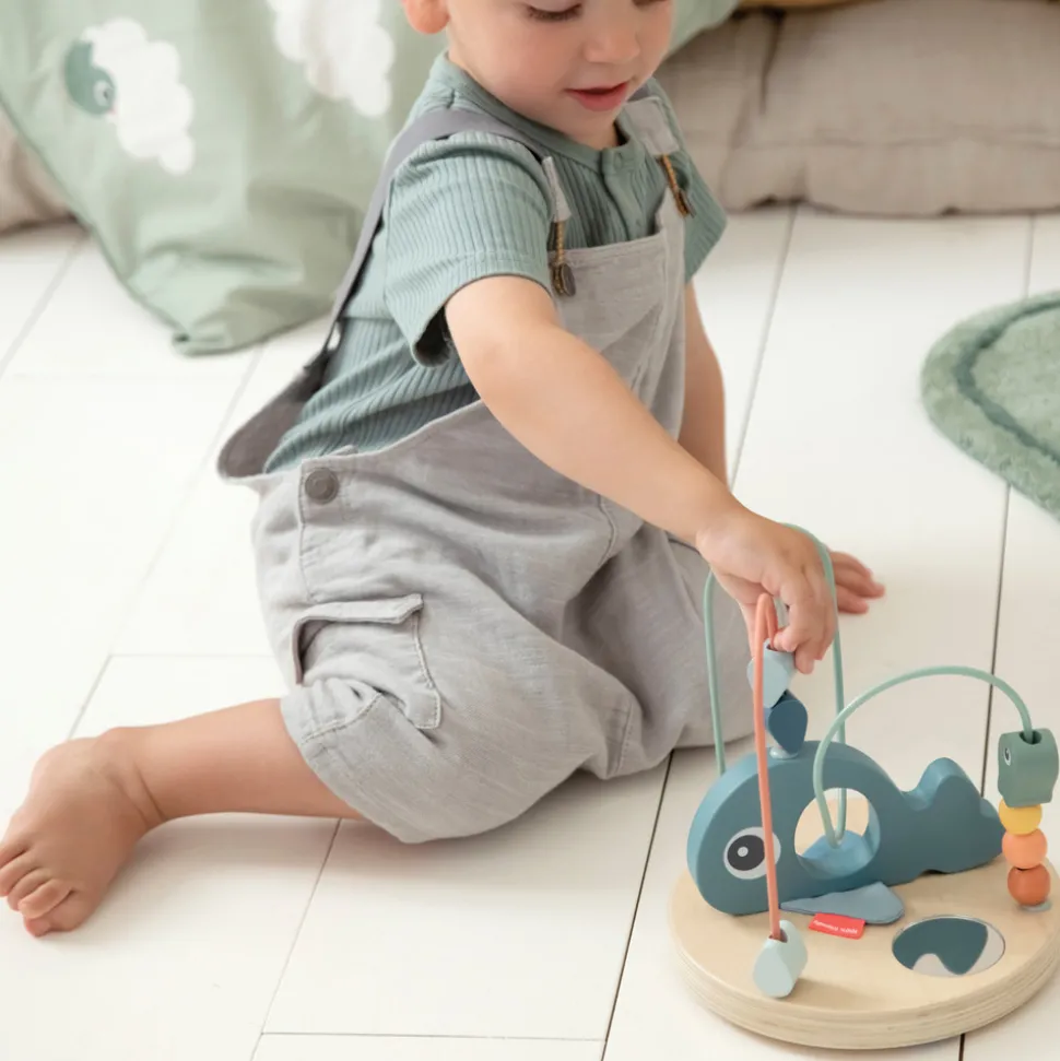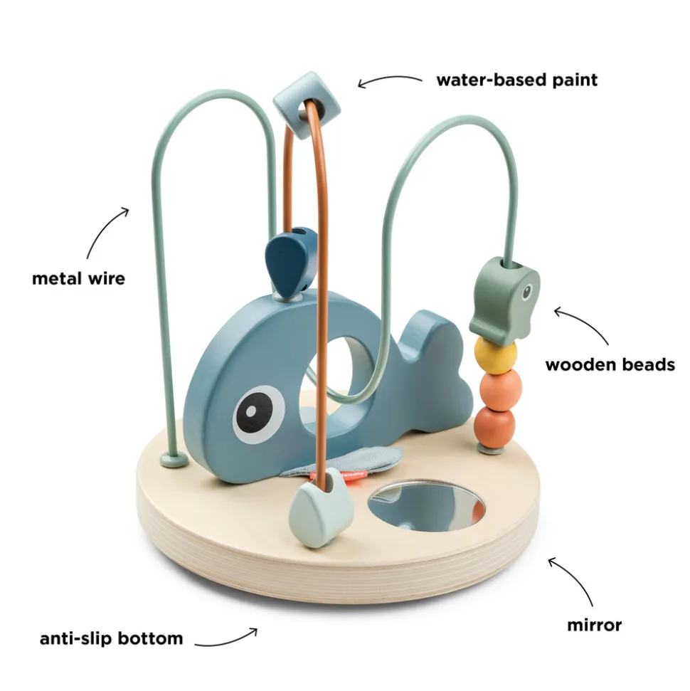 Med Wally kuglelabyrint kan dit barn flytte de små kugler og fisk fra den ene ende til den anden, og træne finmotorik og pincetgreb gennem leg. Wally og de andre hav-elementer inspirerer dit barn til at være nysgerrig på livet under vandet. De små fingre kan bevæge fisken op, ned og rundt for at udforske den i det lille spejl og barnet kan lade den svømme igennem maven på Wally. Hvalens finner er lavet i blødt, holdbart, knitrende tekstil, og bunden er designet til at stå stabilt på gulvet. Wally trækuglebanen er designet i blå nuancer med farverige detaljer. Den er fremstillet af ansvarligt produceret træ og malet med vandbaseret maling, der er fri for skadelige stoffer – hvilket gør den sikker for dit barn at bruge.