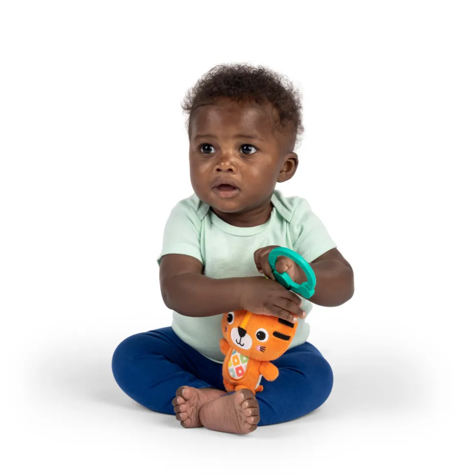 Små tigre elsker Bright Starts’ rangle-legetøjet, der inviterer dem til at rasle, røre og lege. De klare farver og lyde vil opmuntre dit barn til at række ud efter sin nye tigerven, og du vil nyde at se dit barn lære nye færdigheder. Babyer elsker tigerens farverige mønstre, de forskellige materialer, de bløde tekstiler og det skjulte klokkespil, der siger sjove lyde, hver gang de ryster tigeren. Forældrene er derimod glade for denne venlige tigers alsidighed. Legetøjet kan nemlig nemt fastgøres til barnevognen, pusletasken og aktivitetsstativet, så din baby aldrig behøver at undvære sit yndlingslegetøj. Alt dette gør denne fine tigerven til familiens favorit!