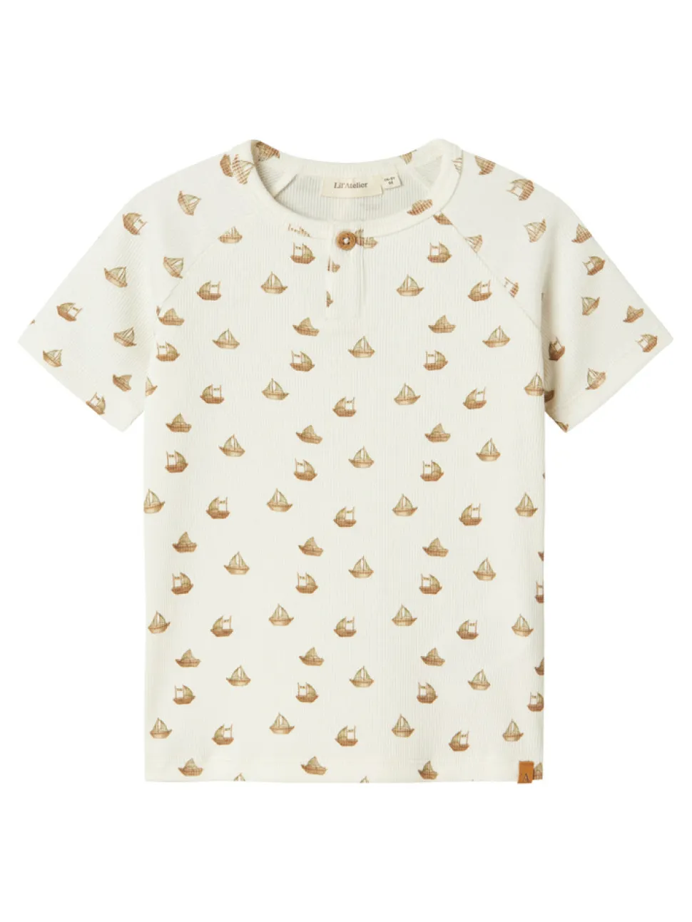 Giv din garderobe et maritimt touch med vores t-shirt med bådprint. Ideel til sommerdage, denne t-shirt kombinerer komfort og stil for et afslappet og trendy look.