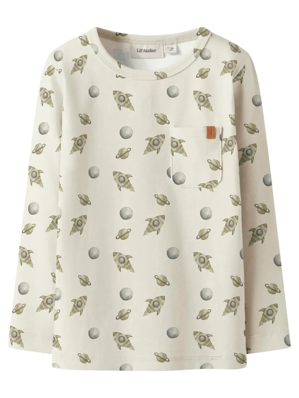 Layo Geo Bluse fra Lil’ Atelier i farven Turtledove er en skøn og blød bluse, der kombinerer komfort med et legende design. Blusen har et charmerende rumtema med små raketter og planeter, som gør den ekstra sjov for de mindste. Den neutrale lyse farve gør blusen nem at matche med både bukser og nederdele, og den praktiske brystlomme med et lille mærke tilføjer et fint, diskret detalje. Blusen er langærmet og egner sig perfekt til både hverdag og leg, hvor barnet kan bevæge sig frit og komfortabelt. Et oplagt valg til garderoben, når der skal være plads til både fantasi og funktionalitet.