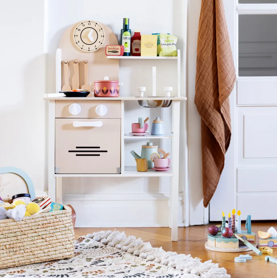 Det fineste legekøkken i træ, i nordiske farver, passer perfekt til børneværelset. Her kan dit barn udfolde sig som kok eller bager i sit helt eget køkken.