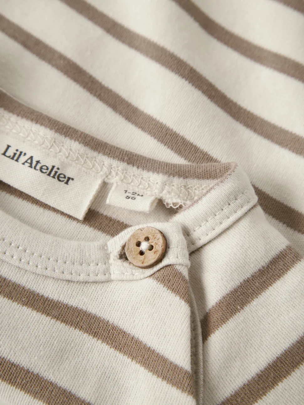 Limia Langærmet Body fra Lil’ Atelier er et skønt valg til hverdagsgarderoben. Den bløde bomuld sikrer komfort hele dagen, og det tidløse stribede mønster i farven Turtledove passer til både piger og drenge. Bodyen har lange ærmer, som giver ekstra varme på kølige dage, og de praktiske trykknapper i bunden gør det nemt at skifte ble. En fin knapdetalje ved skulderen giver et ekstra pift til det enkle design. Bodyen er ideel til lag-på-lag og kan bruges både alene og under andet tøj, så dit barn altid er klædt komfortabelt og stilfuldt på.