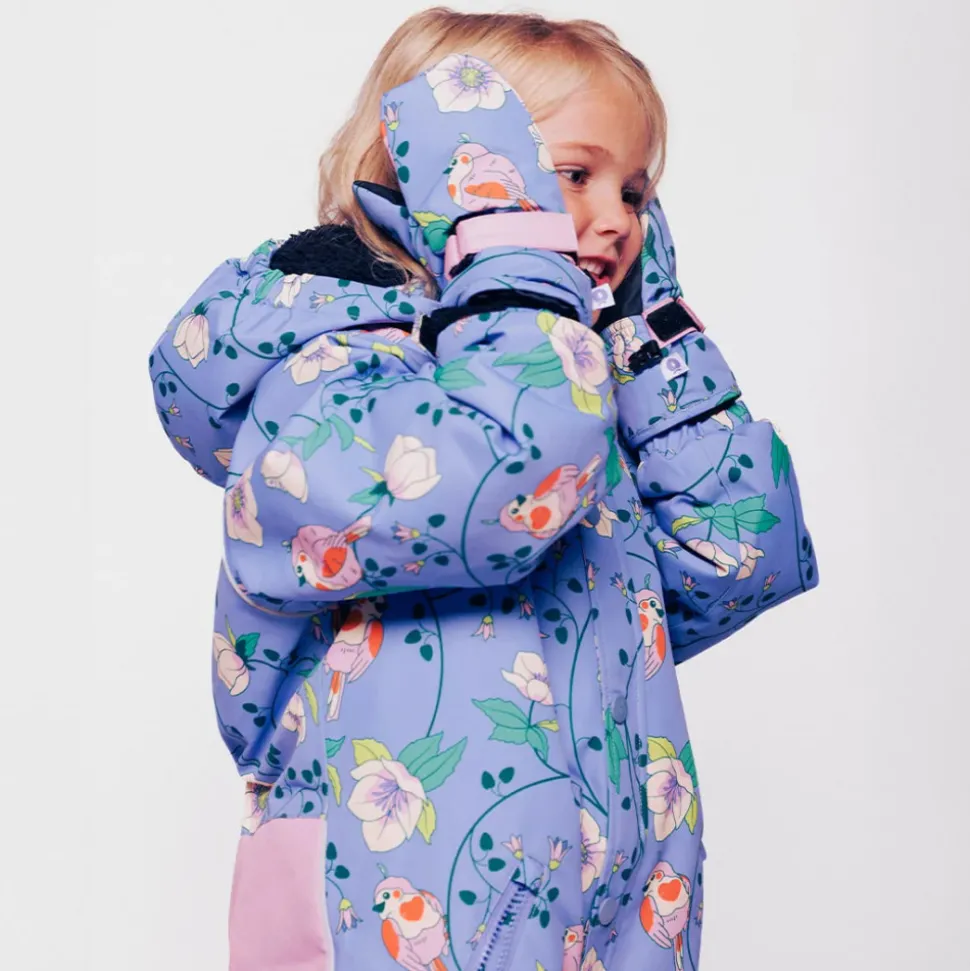 Luffer med fugle og blomster. Disse luffer har en justerbar velcrostrop ved håndledet og kan klipses sammen med et spænde. Handskerne har slidstærk belægning i i håndfladen og rib ved håndleddene, der forhindre kold vind og sne fra at trænge ind.