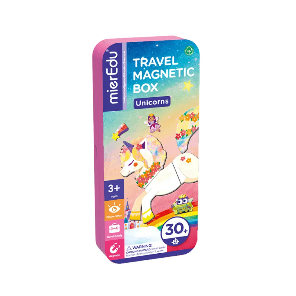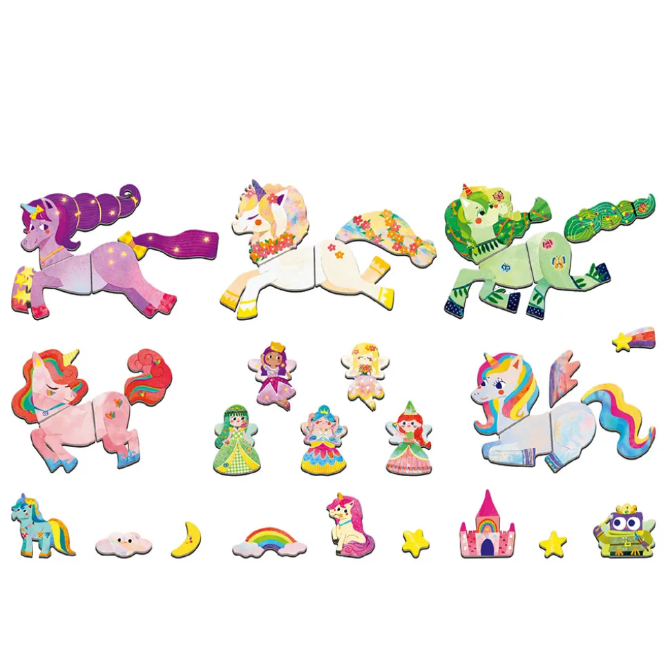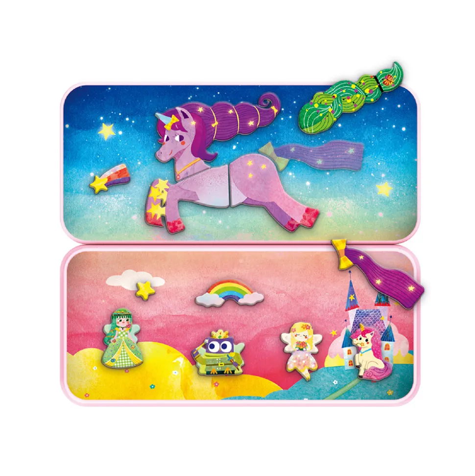 Dette magnetiske legesæt med enhjørning-tema indeholder to baggrunde og mere end 30 magnetiske brikker til at sammensætte sin egen figur og finde på sjove historier.