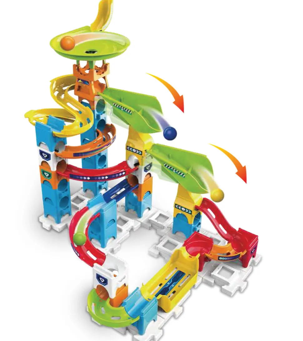 Hvilke seje kreationer kan du skabe med dette legesæt med 47 dele? Marble Rush Double Drop Sættet har 2 fyld- og tip-moduler, så kugler kan samles og falde ned ikke én, men to gange! Sættet indeholder 5 kugler og et kugleaffyringsmodul, som du kan sende dine kugler af sted med! Dette legesæt passer til andre VTech Marble Rush-dele, så du kan kombinere dem for at føje det til din Marble Rush-verden! Indeholder en samlevejledning med farvekoder! Fra 4 år.