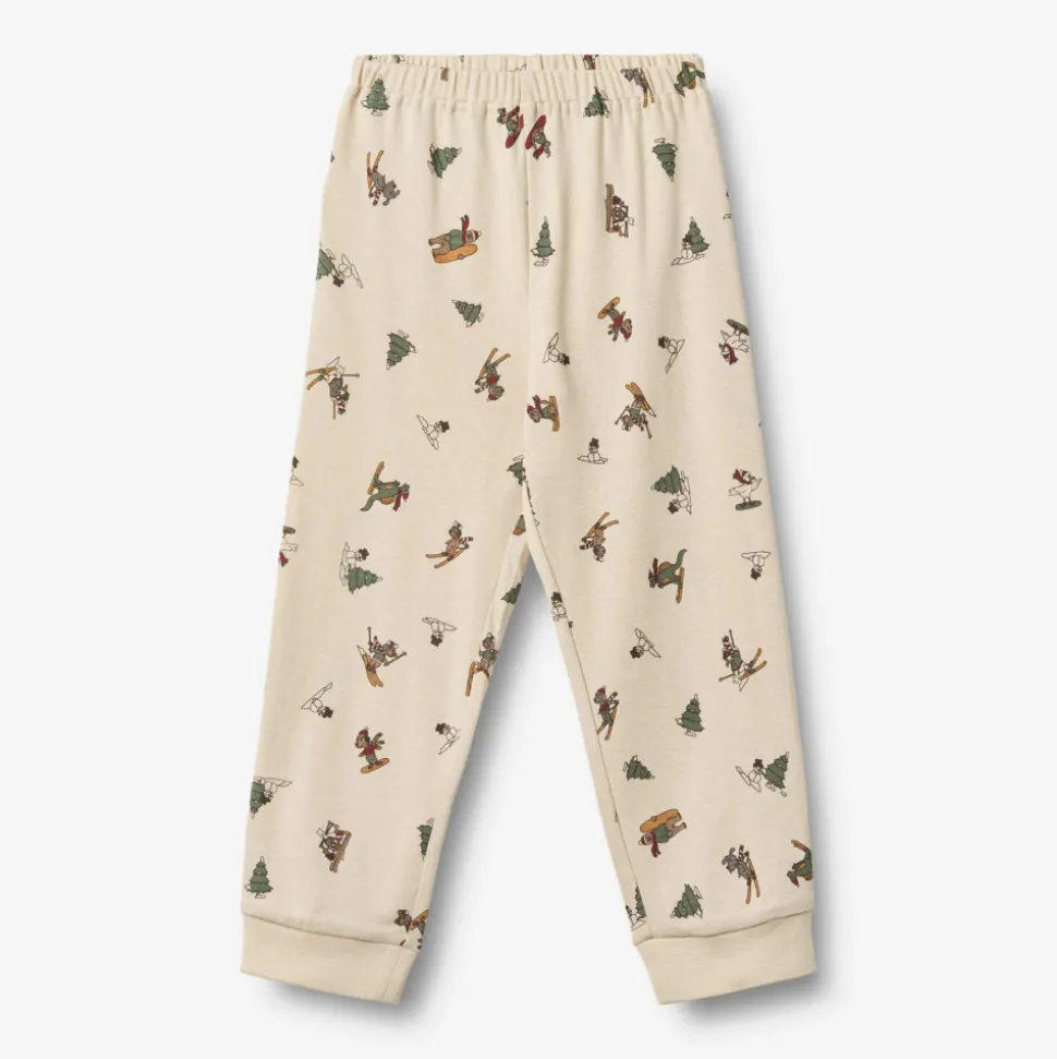 2-delt pyjamas med julemotiver i blødt økologisk bomuld til børn. Wheats charmerende pyjamas med julemotiver er skabt til at sprede magisk julestemning. Med sin bløde pasform er den både let og behagelig for dit barn at have på hele dagen.Det bløde nattøj er perfekt til de kolde efterårs- og vinternætter. Pyjamassættet kommer med matchende T-shirt og bukser. T-shirten er simpel og langærmet, hvor bukserne har en blød elastik i taljen.