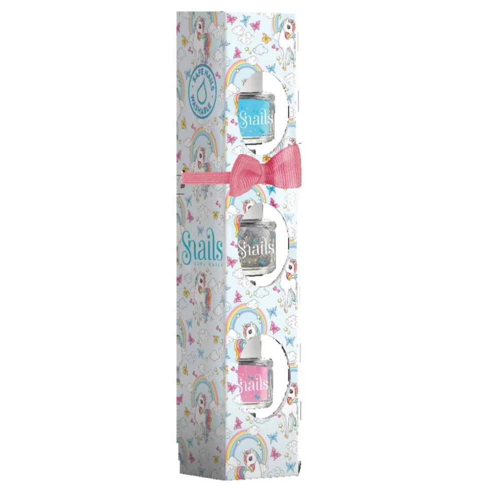 En flot gaveæske indeholdende 3 skønne Snails neglelakker. Neglelakken vaskes nemt og hurtigt af igen, blot med lidt vand og sæbe.