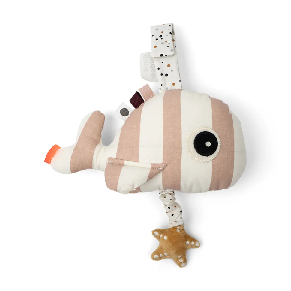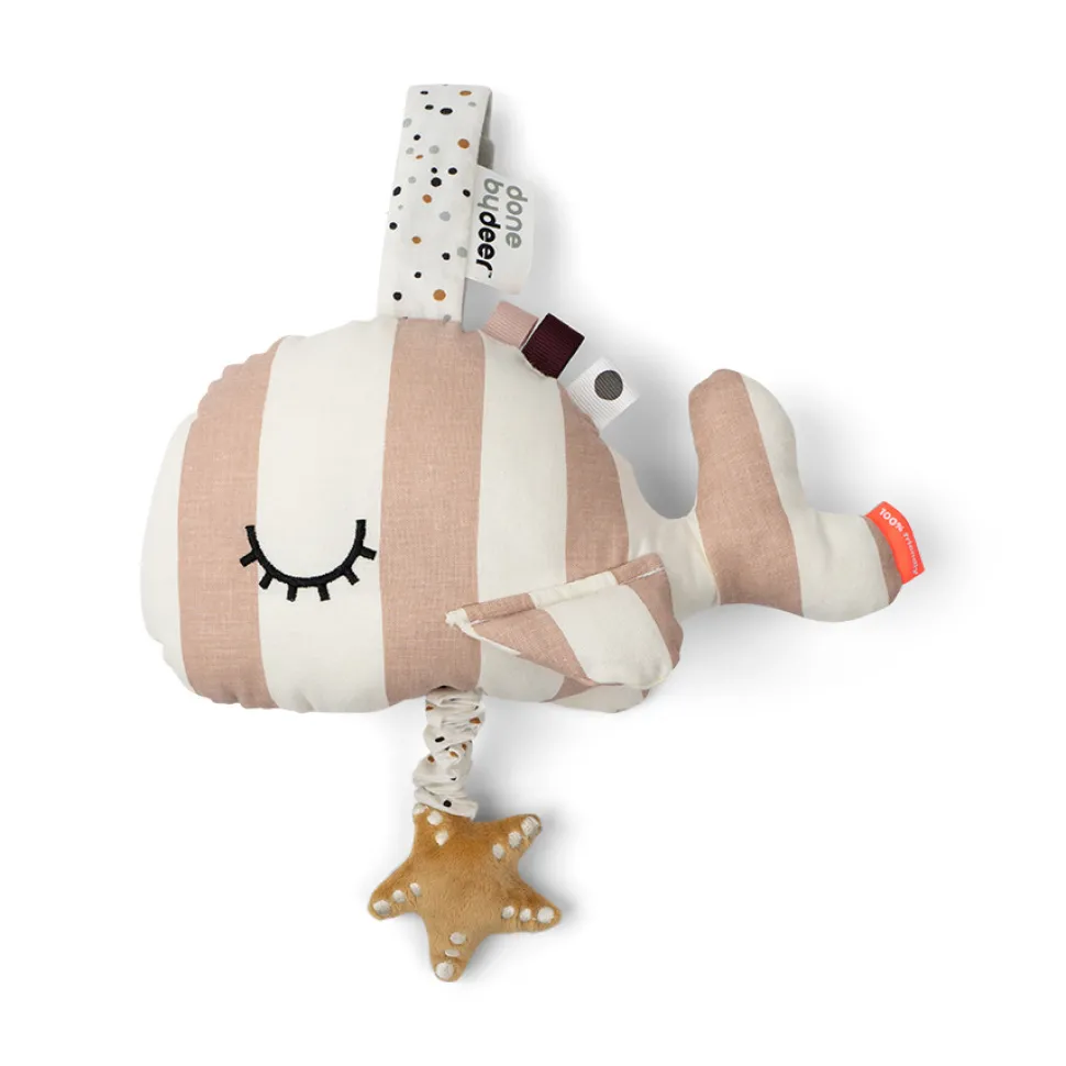 Lad søde Wally lulle de små i søvn eller lad den underholde ved puslebordet med den beroligende melodi ‘Over the rainbow’. Træk i den bløde søstjerne under Wallys mave, så vil den søde melodi afspilles. Det yndige musikalske legetøj er en dekorativ tilføjelse til børneværelset. Den praktiske velcro lukning gør det nemt at fastgøre den hvor som helst. Den søvnige hval med fine hvide og pudderfarvede striber har søde detaljer med kontrastfulde prikker og en blød søstjerne på maven. Den vil berolige de små, når det er tid til at slappe af eller tage på tur til drømmeland.