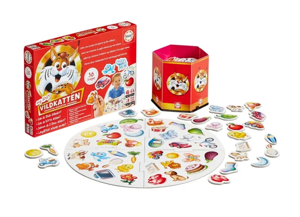My first Vildkatten er sjovt og underholdende iagttagelsesspil i junior udgave. Det samme, som du kender fra det almindelige Vildkatten-spil, men her er der altså bare 36 motiver at vælge imellem, hvilket gør det langt mere overskueligt for børn. Spillet handler om at man vender et billedkort, og hurtigst muligt skal finde motivet på spillepladen. Dette kræver både overblik og koncentration. Den spiller, der får flest billedkort, vinder spillet. Brikkerne er egnet til mindre børn, og er fremstillet i en god og kraftigt kvalitet. Æsken indeholder: billedkort, opbevarings-kasse, spillebræt i 4 dele samt danske spilleregler. Spilletid: 10 min. Antal deltagere: 2-4