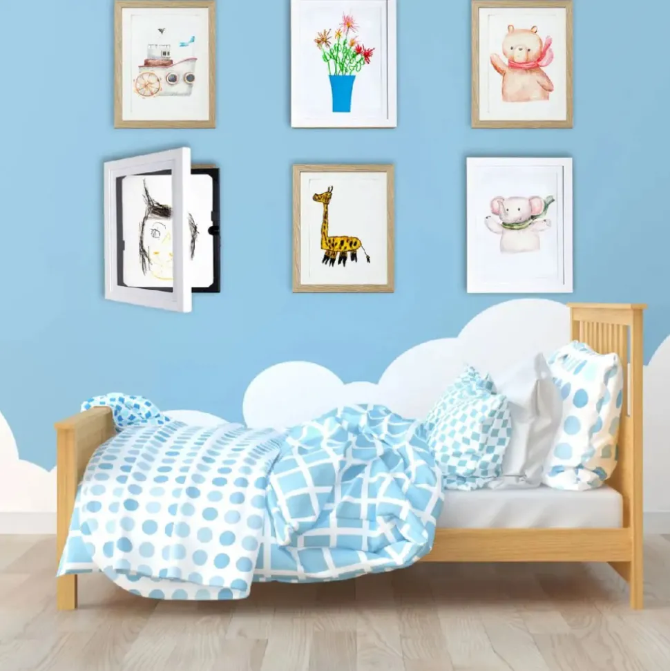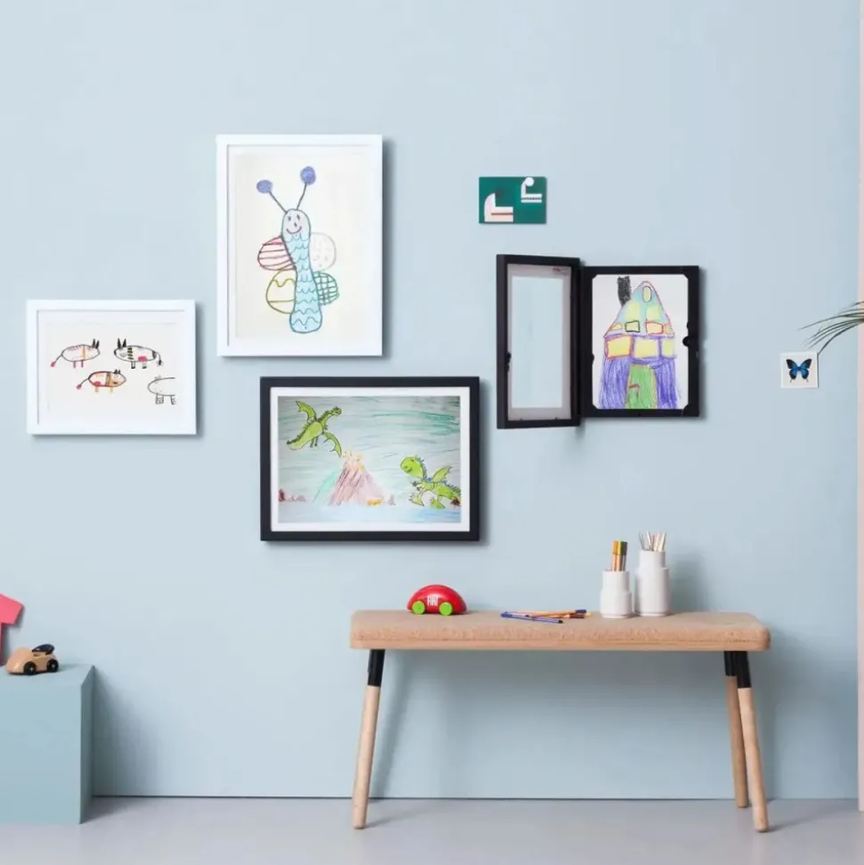 Med denne fine My Little DaVinci ramme kan alle kunstværkerne som den lille kommer hjem med få en helt særlig plads på væggen, uden at køleskabet er fyldt, og uden bekymring om tegningen går i stykker ved at hænge fremme. DaVinci rammen gør det nemlig muligt at skifte nemt mellem tegningerne, ved at åbne den lille lås foran. Perfekt til fotos, kunstværker, malerier, collager, tegninger, certifikater eller anden dokumentation. Rammen kan indeholde optil 50 stykker A3-papir, og måler H: 49 x B: 36,5 x D: 4,5 cm.
