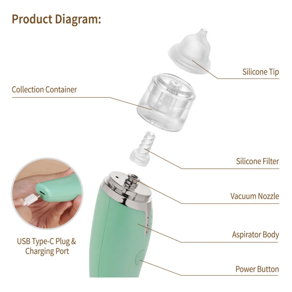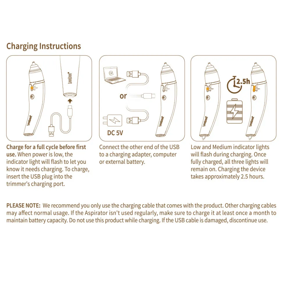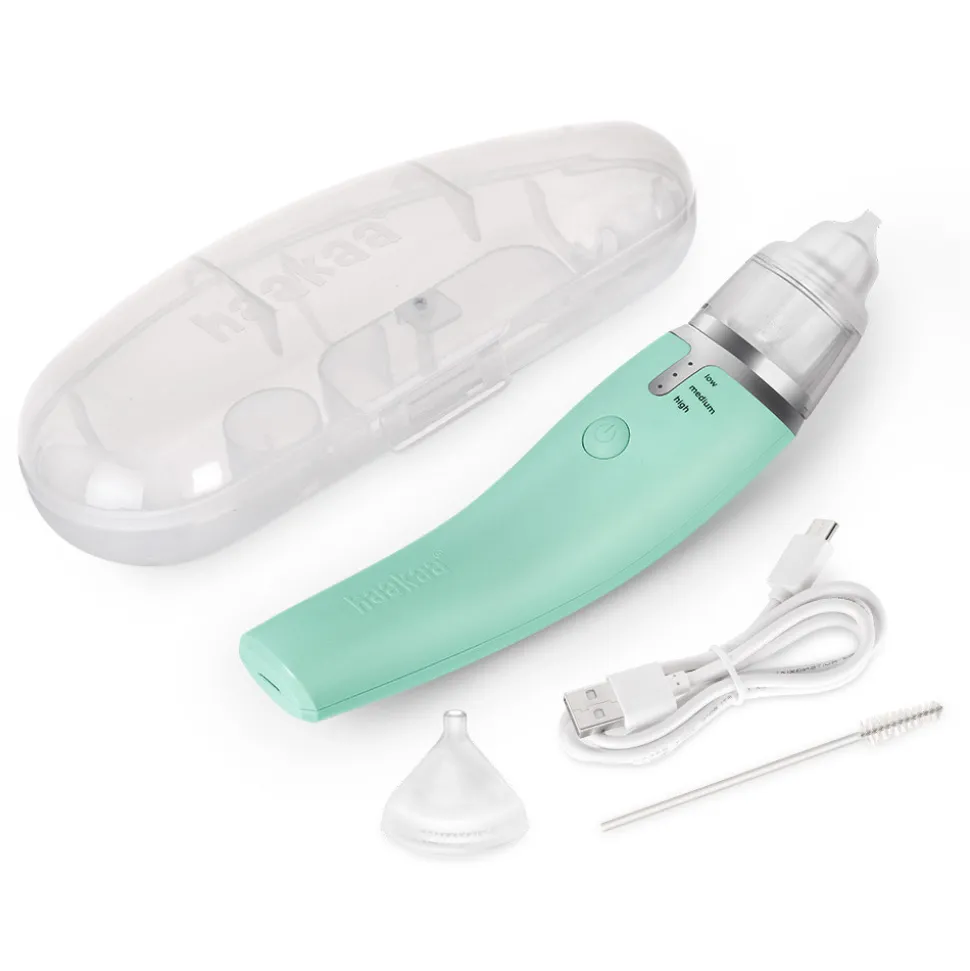 Haakaas genopladelige næseaspirator bruger en skånsom, men effektiv sugekraft for at lindre din lilles tilstoppede eller løbende næse. Dette praktiske lille redskab er nemt at bruge med blot en enkelt knap, der kan skifte mellem tre forskellige styrker for at rense selv de mest tilstoppede næser, med kun en hånd. Den leveres med to bløde og sikre silikonespidser der er helt perfekte til sarte små næser og kan let steriliseres efter brug.