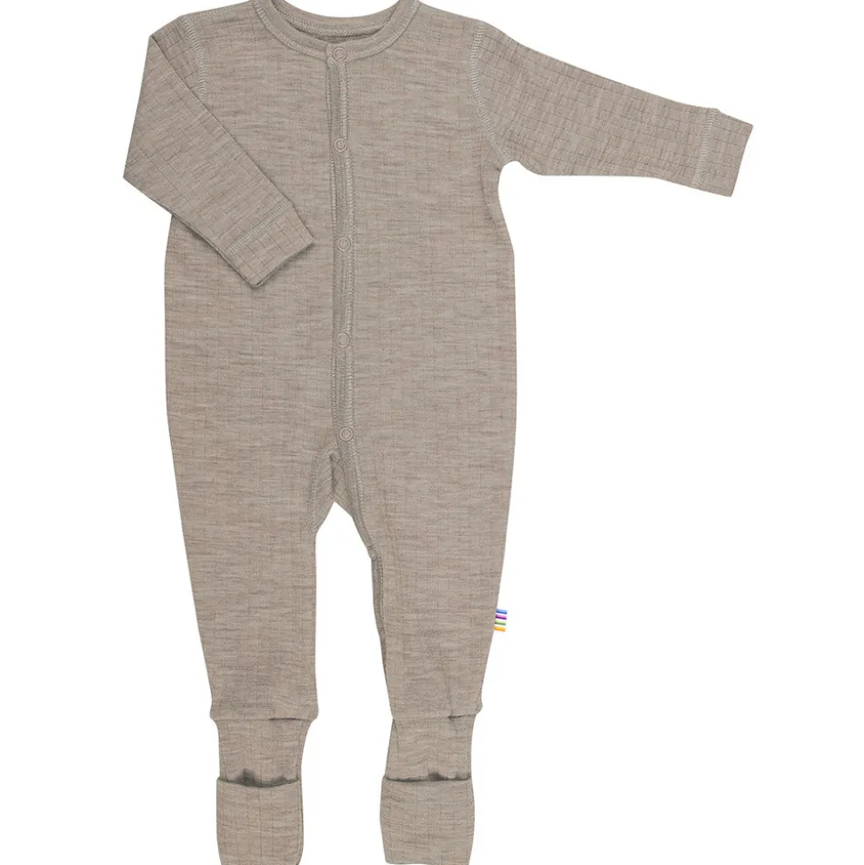Heldragt med 2 i 1 fod. Lukkes med trykknapper helt ned gennem det eneben. Virkelig en blød, elastisk let uldkvalitet med lodret rille mønster. Kvalitetens strækevne gør at den er behagelig at have på. Ensfarvet. Pure merino wool og Nordic Ecolabel mærket.