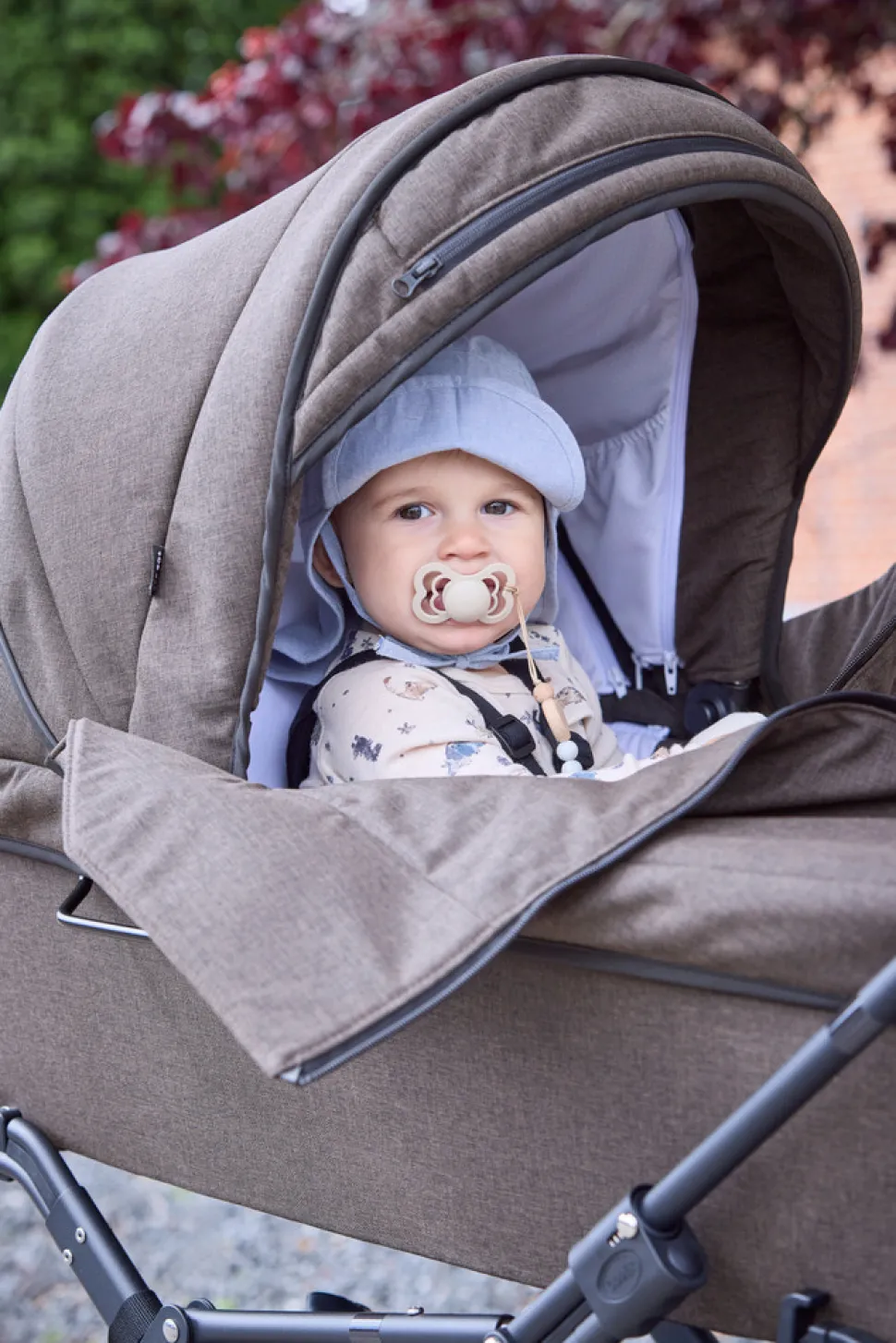 - Integreret solsejl i kalechen og tekstil UV 50+.
