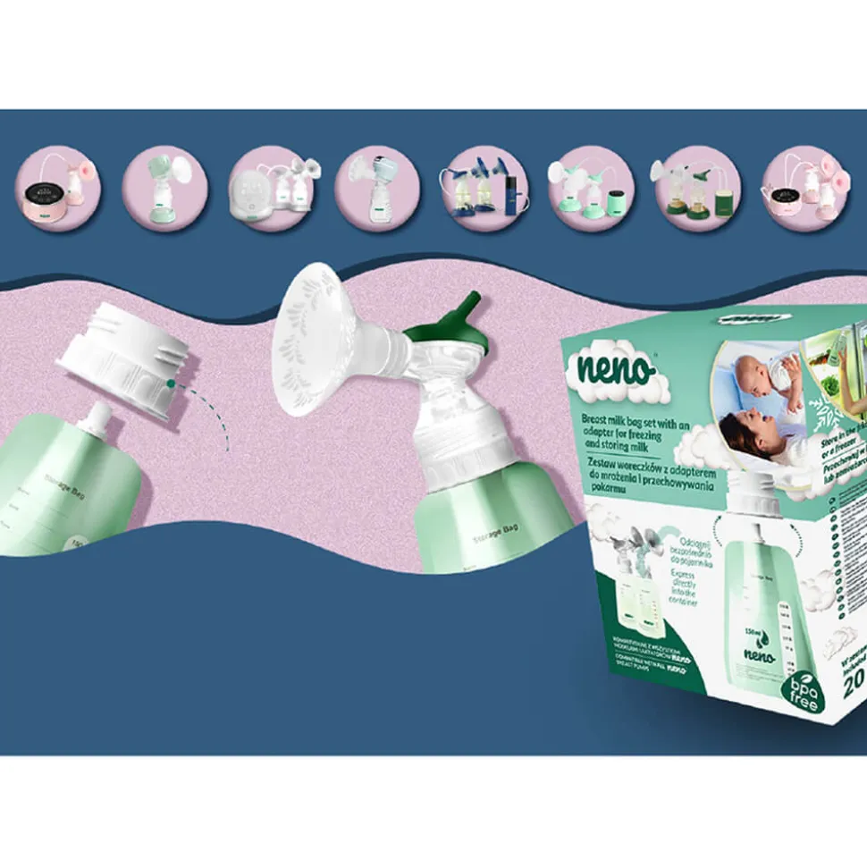 Disse poser er til bekvem og hygiejnisk opbevaring af pumpet modermælk. De er fremragende at opbevare i både køleskab og fryser og det er også muligt at varme modermælken direkte i posen. Designet gør, at de kan stå oprejst under brug og lægges fladt for at spare plads under opbevaring. Poserne kommer med en praktisk adapter som gør at de kan tilsluttes direkte til Nenos brystpumper. Funktionen er smidig, tidsbesparende og frem for alt hygiejnisk, da modermælken ikke flyttes mellem forskellige beholdere. Adapteren passer også sammen med Nenos sutteflasker så låget med din sut kan tilsluttes direkte til posen. Praktisk og pladsbesparende når du er på farten. Opbevaringsposerne er lavet af sikker plast af høj kvalitet og lukkes med skruelåg for at eliminere risikoen for lækage og forurening.