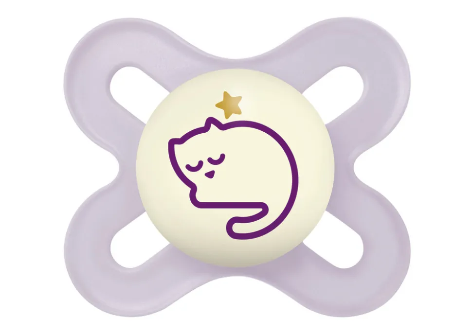 Sutten leveres i en praktisk opbevarings- og steriliseringsboks, som gør det nemt at sterilisere den i mikrobølgeovnen. Den selvlysende knop gør det desuden let at finde sutten i mørket – perfekt til rolige nætter.