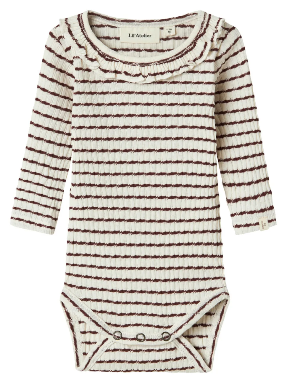 Sæt det perfekte outfit sammen til dit barn med kvalitetsstyles til hverdagen, og skab et behageligt og trendy look.Jersey er et let og elastisk stof med en blød overflade og inderside, der giver en behagelig fornemmelse og bevægelsesfrihed. – Produkttype: Bodysuit – Halsudskæring: Rund halsudskæring – Ærmer: Lange ærmer (L/S) – Lukning: Trykknaplukning – Ekstra detaljer: Flæser, mærke – Advarsel: ADVARSEL! Holdes væk fra ild