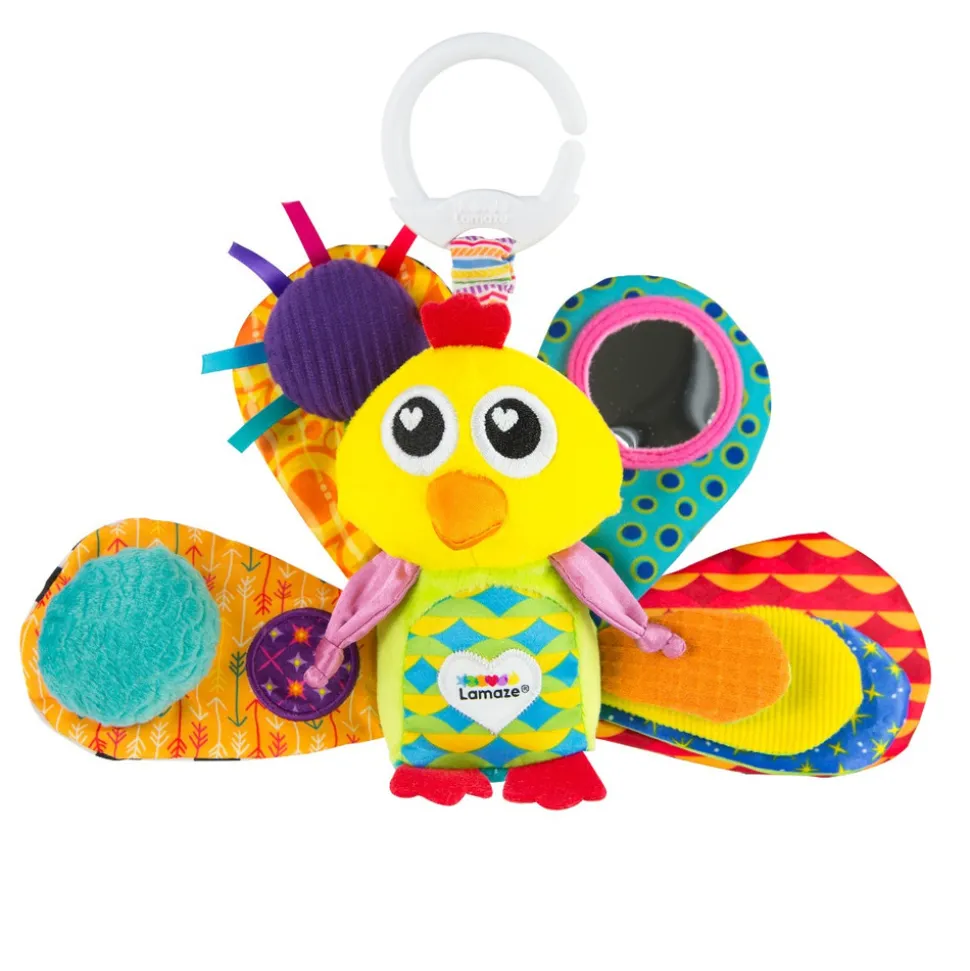 Lamaze Påfugl rangle Ranglen kan let monteres på seng, kravlegård eller lignende. Ranglen har forskellige effekter, så som bidering, knitrestoffer, piv lyd og bløde overflader.