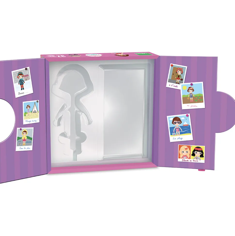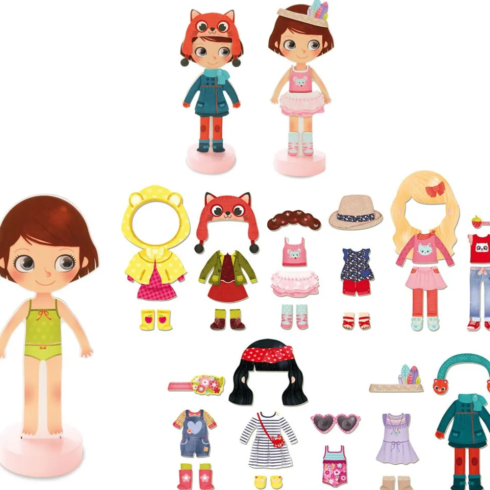 Den klassiske påklædningsdukke i et moderne udtryk. Lavet i træ med fod, så hun selv kan stå op, og magnetisk, så tøjet bliver siddende. Hun har flere smukke outfits både til sommer og til vinter, til skole og fritid. Sættet indeholder ialt 42 magnetiske dele: nederdele, kjoler, hatte og bukser. Chloe kan endda skifte frisurer.