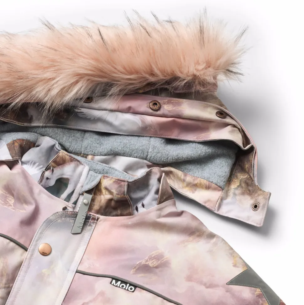 Indvendige elastikstropper og elastik ved ærme- og ben åbninger sikrer, at dragten sidder godt og effektivt holder sne, regn og vind ude. Refleksbånd og to store stjerner på benene øger synligheden i trafikken. Dragten er foret med genanvendt polyesterfleece på udsatte områder og isoleret med 3M™ Thinsulate™, som holder barnet varmt – selv i temperaturer helt ned til -25 °C.