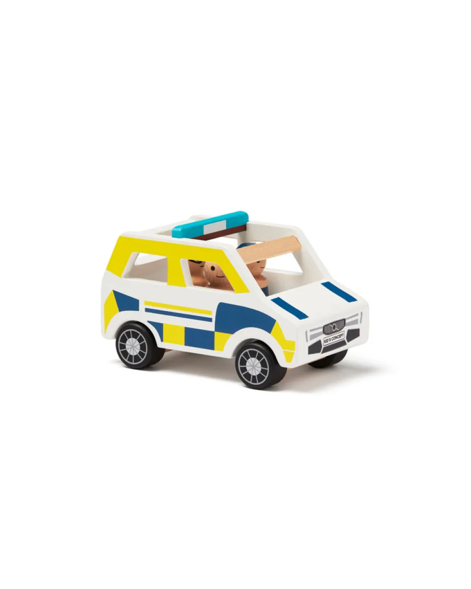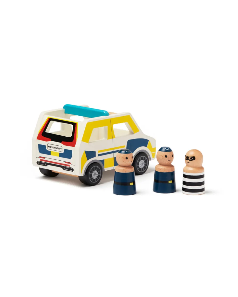 En slidstærk politibil i træ med plads til tre figurer, der nemt kan tages ind og ud gennem det åbne tag. Pakken indeholder en politibil, en tyv og to politibetjente. Husk, at selv de bedste politibiler kan have brug for service fra tid til anden for at holde dem i topform.