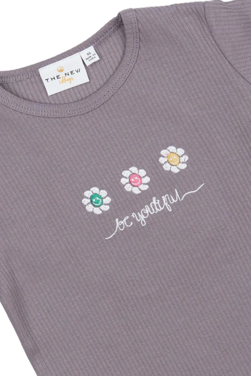 Langærmet ribstrikket t-shirt med et sødt print af 3 smukke og smilende blomster samt teksten “Be yourself”. Denne enkle basis-t-shirt fra THE NEW siblings er alsidig og kan nemt styles med mange forskellige underdele for at skabe et nyt look hver gang.