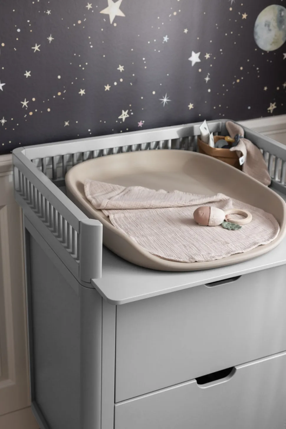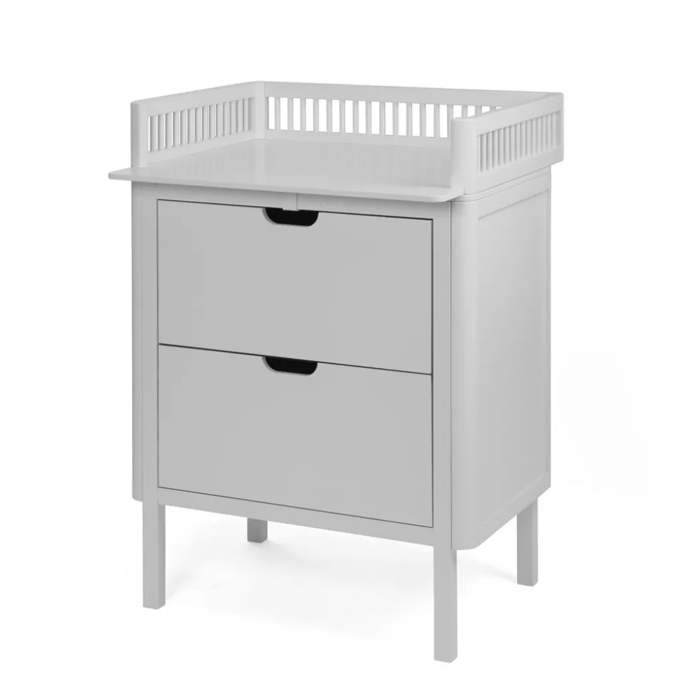 Sebra Puslebordet er et elegant, funktionelt og dansk-designet 2-i-1 møbel, som kommer med en kommode, en pusleplade og henholdsvis to skuffer. Puslebordet er designet med et skandinavisk og tidløst udtryk, der harmonerer med de øvrige møbler fra Sebra’s klassiske møbelkollektion. Et funktionelt, sikkert og klassisk puslebord uden uønsket kemi og med lang levetid til børneværelset, soveværelset, badeværelse eller et andet sted i hjemmet. Her ses Sebra Puslebordet med skuffer og i farven Classic White. Sebra Puslebordet med skuffer er et puslebord, der let kan forvandles til et klassisk opbevaringsmøbel, når behovet for puslebordet hører op. Puslepladen er lukket bagtil og til siderne og fremstår med en forhøjet kant med små runde tremmer, som er med til at give puslebordet det karakteristiske udtryk, som Sebra Sengen er så kendt og elsket for. Puslepladen (indvendige mål) har en dybde på 66 cm og en bredde på 69 cm, hvilket giver plads til en puslehynde og andre puslefornødenheder, som kræves i forbindelse med et bleskift, tøjskift eller blot en hyggestund med babypludder. De to skuffer giver mulighed for opbevaring at tøj, bleer, legetøj eller hvad der nu måtte være behov for. Skufferne er udstyret med ”softluk”, som sikrer, at skufferne lukkes stille og roligt. Derved minimeres risikoen for at få fingrene i klemme, og det er en god ting på netop børneværelset, hvor små fingre ikke altid er så hurtige, som de store. Den praktiske forvandling fra puslebord til opbevaringsmøbel sker ved, at puslepladen nemt fjernes fra underdelen. Denne egenskab gør, at det ikke er nødvendigt at opmagasinere et komplet puslebord eller skille sig af med puslebordet i perioden imellem blebørn – eller når behovet for et puslebord blot forsvinder helt. Det giver puslebordet en ekstra lang levetid og et produkt, der kan vokse med barnet eller dets søskende – et møbel, der let kan gå i arv. Fronterne fremstår med udskårne greb, der sammen med kommodens afrundede hjørner er med til at øge sikkerheden på børneværelset – ingen skarpe kanter, som kan give ridser og skrammer. Puslebordet er på fire ben, hvilket sikrer et lettere og mindre bastant udtryk end et puslebord uden ben. Det giver naturligvis også mulighed for opbevaring under kommoden, hvis behovet er der.