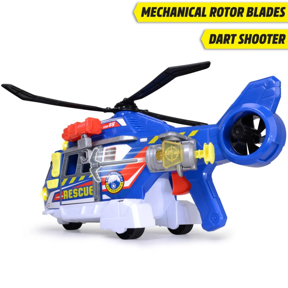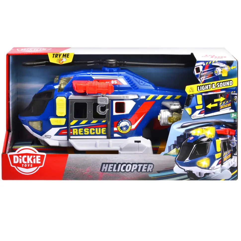 Dickie Toys redningshelikopter med frihjul, lys, lyd, vinsj, dører som kan åpnes og redningsbåre. 36 cm. Fra 3 år.