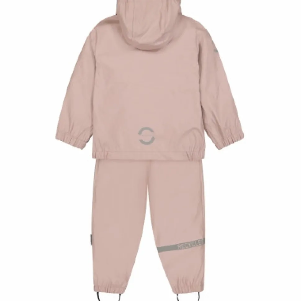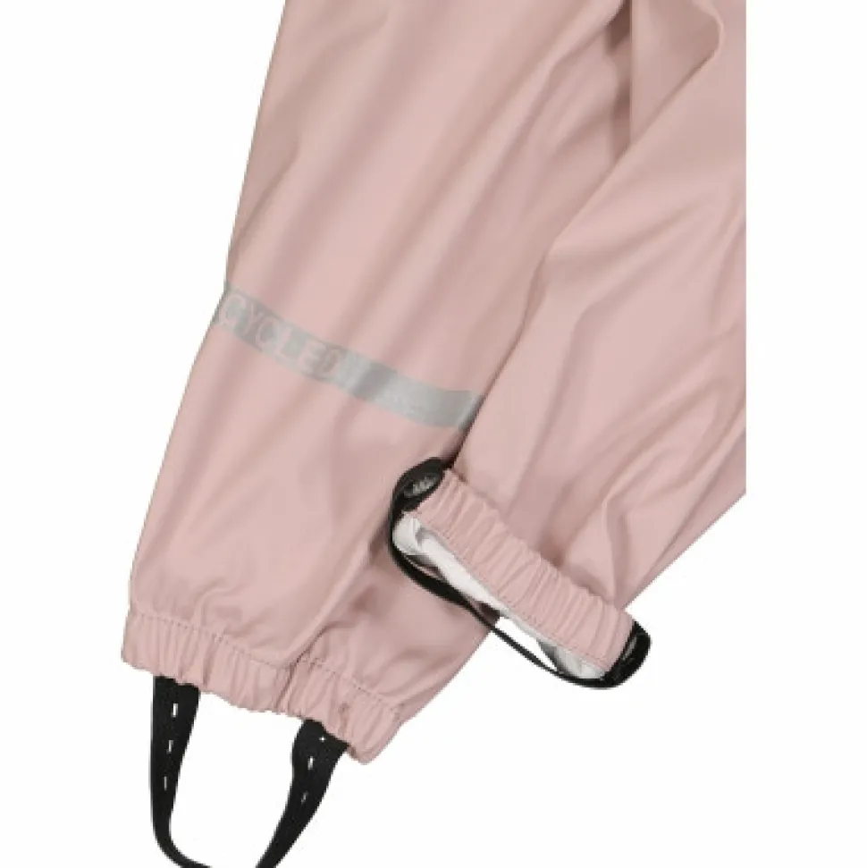 Praktisk og funktionelt recycled regnsæt fra mikk-line, der holder dit barn tørt. Regntøjet er udstyret med refleksdetaljer så dit barn kan færdes sikkert i mørket. Regnsættet er naturligvis både vand- og vindtæt. Sømmene er svejsede, hvilket forhindrer vand i at trænge igennem samlingerne. Buksen har fodstropper, som holder buksen under gummistøvlen. Regnbukserne har justerbare seler, tætsiddende elastik i taljen og et ekstra stykke stof der dækker både foran og bagpå kroppen.