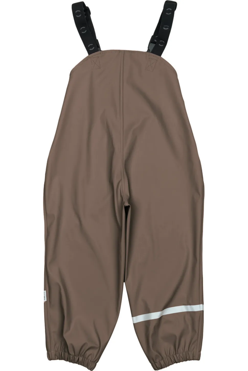Placer de justerbare fodstropper under støvlerne, for at holde fødderne tørre og undgå at bukserne glider op. Selerne kan tilpasses efter behov, og så har sættet har et indvendigt navneskilt med plads til mere end ét navn, så giv det gerne videre, så endnu et barn kan få glæde af det.